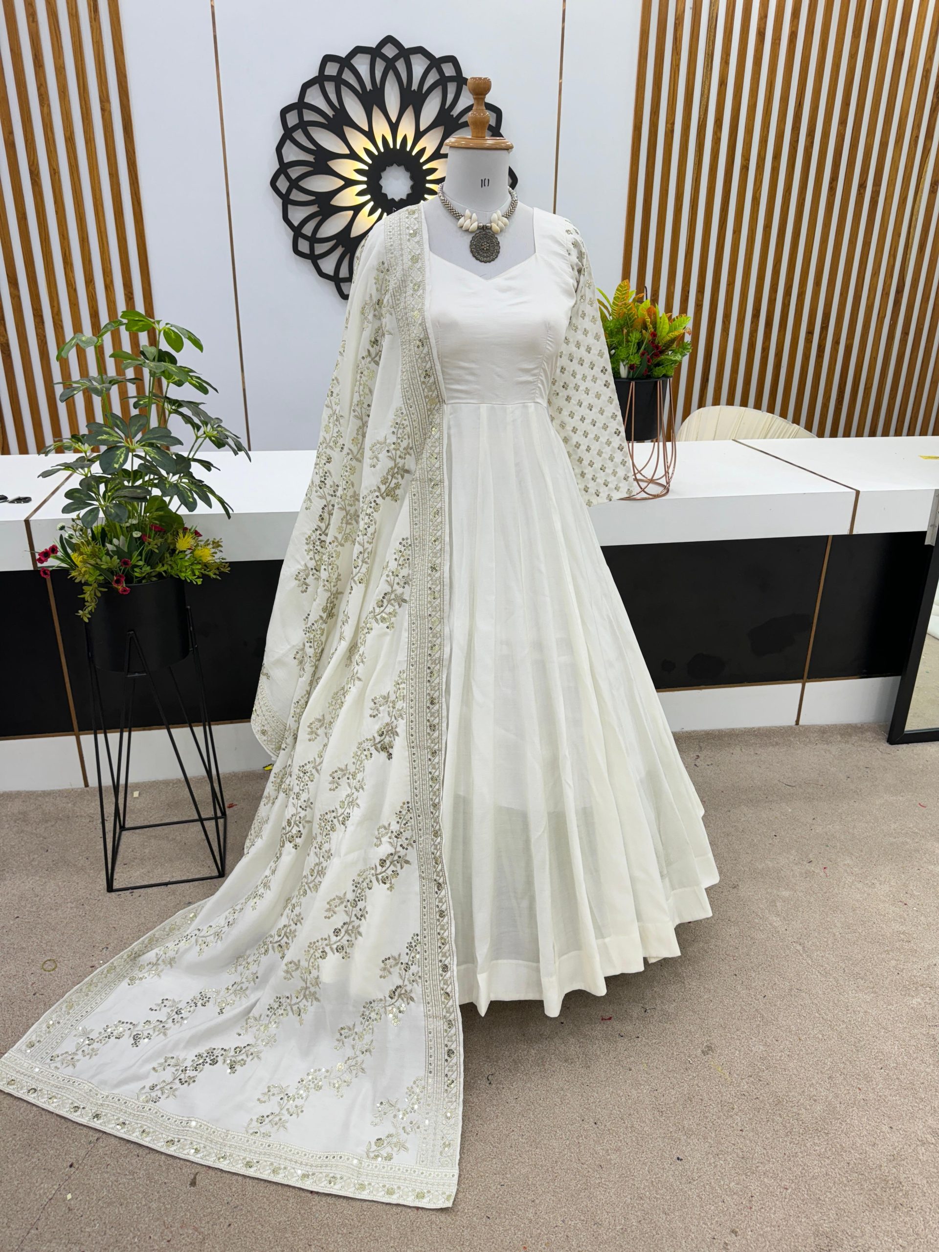 94 reviews for White Chinon Silk Embroidery Sequence Work Gown