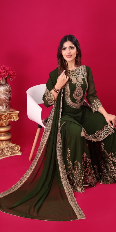 Bottle Green Faux Georgette Embroidery Sequence Work Salwar Suit