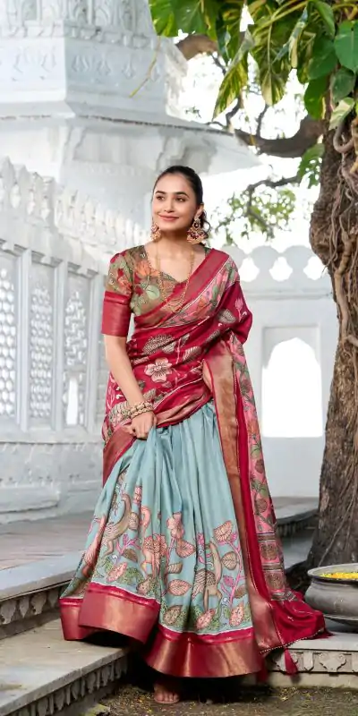 Fabrics | Lehenga: Dole Silk Inner Micro Cotton Work :Printed Kalamkari With Zari Weaving Border Length : 42+ Inch Type : Semi Stitched (Free Size)Waist : Supported Up To 42 Lehenga Stitching : Stitch With Canvas Lehenga Closer : Drawstring With Zip Length : 41Flair : 3.80 MeterBlouse : Dole Silk Jacquard Silk Work :Printed Kalamkari With Zari Weaving Border Sleeves : Half Sleeves Type : Un-StitchedBlouse Length : 0.80 MeterDupatta : Dola Silk Jacquard SilkDupatta work : Kalamkari Print With Zari Weaving Border Also Comes With Both Side Tassels Length : 2.4 Meter |