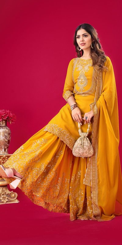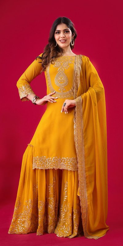 Yellow Faux Georgette Embroidery Sequence Thread Work Salwar Suit