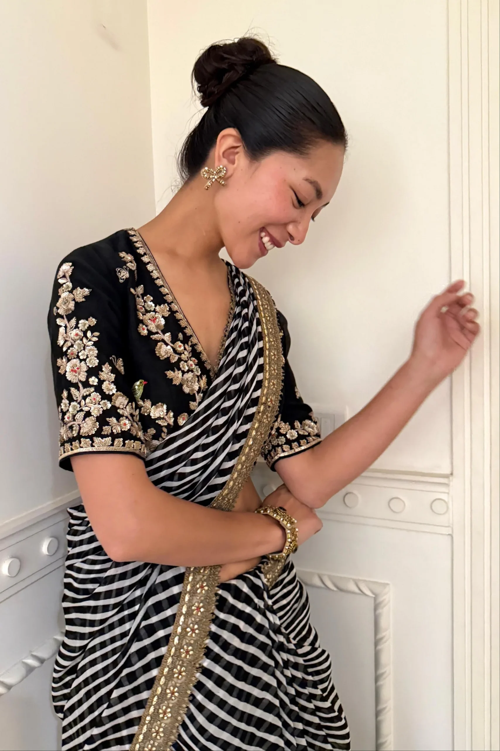 This georgette Indian saree ka blouse piece normal quality ka hai; simple tailoring se theek lagta, designer fit expect ho toh extra kaam chahiye.