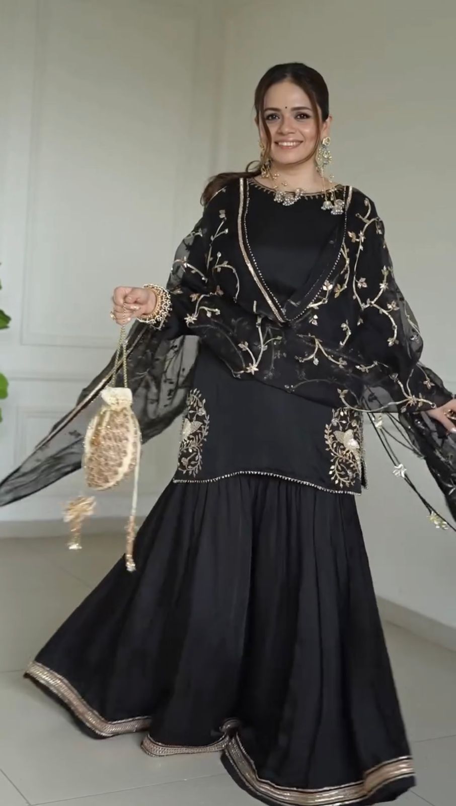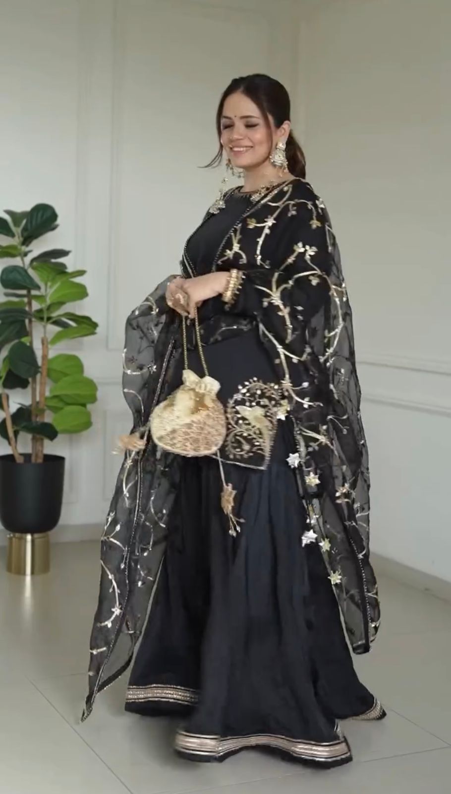 Top: Fabric: Pure Natural Crep With Embroidery Sequence Work Sleeves: Full Inner: Heavy Micro Cotton Length: 39-40 Inches Sizes : Free Size Semi Stitched Bottom (Sharara Palazzo): Fabric: Pure Natural Crep With Embroidery Sequence Work Length: 40-41 Inches Dupatta: Fabric : Pure Fox Georgette With Embroidery Sequence Work With Less Border |