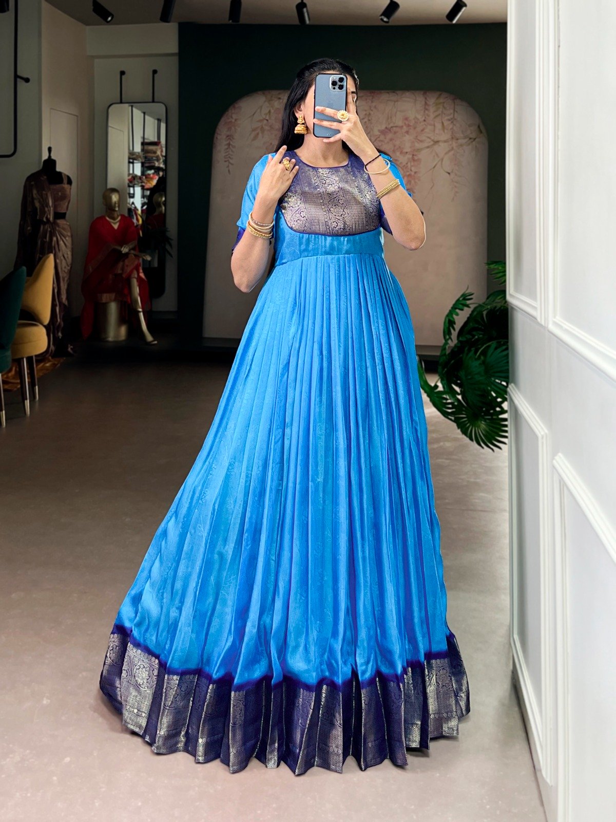 Dress (Stitched) Dress Fabric : Mass Mello Dress Work : Zari Weaving Work Chest : Free Size (Inside 2 inch extra margin available so you can adjust support up to 42 for your body comfort) Waist : 38″ Length : 57″ Sleeve length : 11 Shoulder : 15 Flair : 3.30 Meter Lining : silk (full upto bottom) |