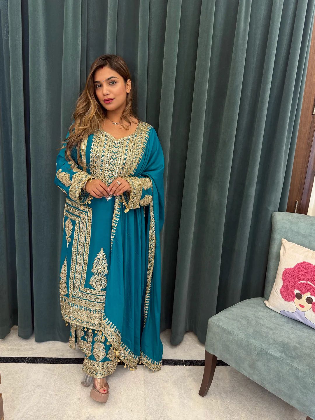 Fabrics | Top Fabric : Pure Chinnon Silk With Heavy Embroidery Coding Dori-Sequence Work With Full Sleeve Top Inner : Heavy Micro Cotton Top Size : Free Size Fully Stitched Ready To Wear Top Length : 44-45 Inch Palazzo Fabrics : Pure Chinnon Silk With Heavy Embroidery Coding Dori-Sequence Work With Elastic Palazzo Length : 40-41 Inch Dupatta : Pure Chinnon Silk With Embroidery Coding Dori-Sequence Work With Lace Border |