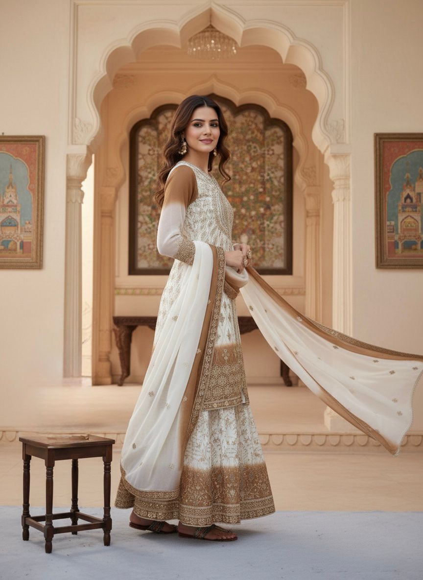 Top Fabric :Heavy Dual Tone Pending Star Georgette With Heavy Embroidery 5 mm Sequence Work With Sleeves