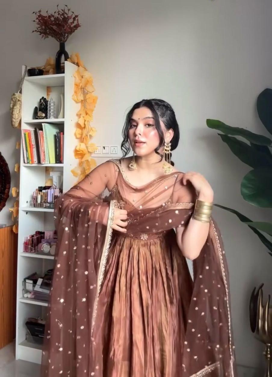 Brown Silk With Embroidery Sequence Work Anarkali Gown