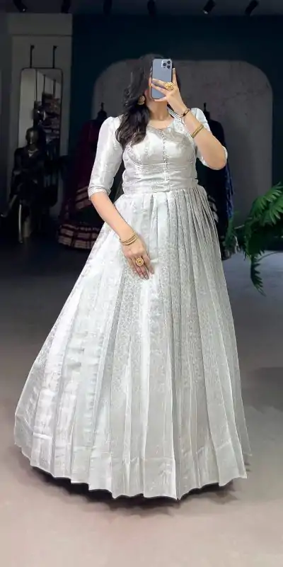 Fabrics | Gown Fabric : Kanjivaram Gown Work : Zari Weaving Work With Lace Touch Up Gown Chest Size : Free Size Semi Stitched(Inside 2 inch extra margin available so customer can adjust up to 38″ to 42″ for your body comfort) Gown Waist Size : 38 Gown Shoulder :15 Gown Length : 55 Gown Flair : 3.80 Meter Gown Lining : Micro Cotton Koti Fabric : Kanjivaram |