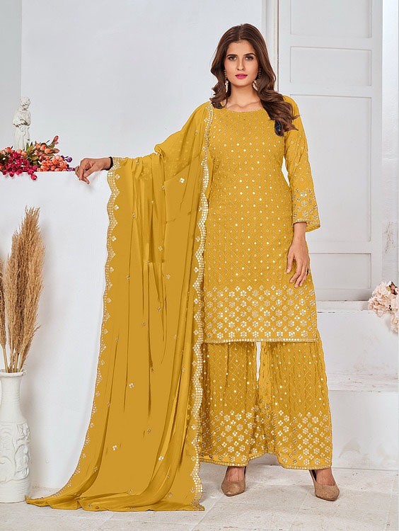 Yellow Georgette Embroidery Stone Work Sharara Suit