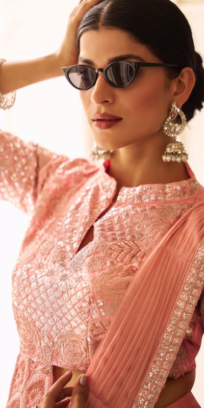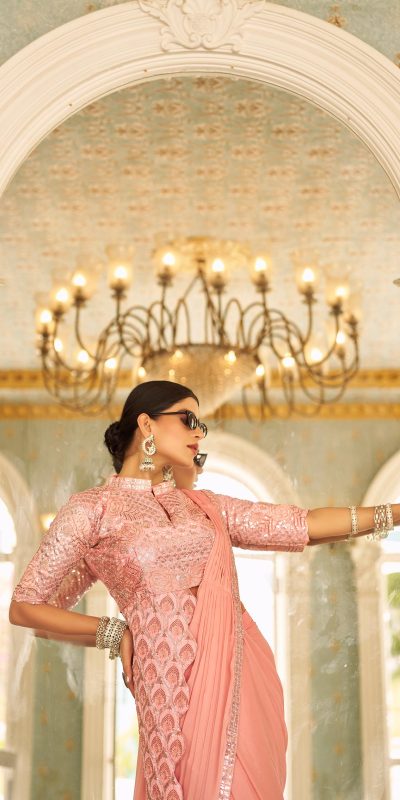 Peach Chinon Embroidery Work Lace Border Saree