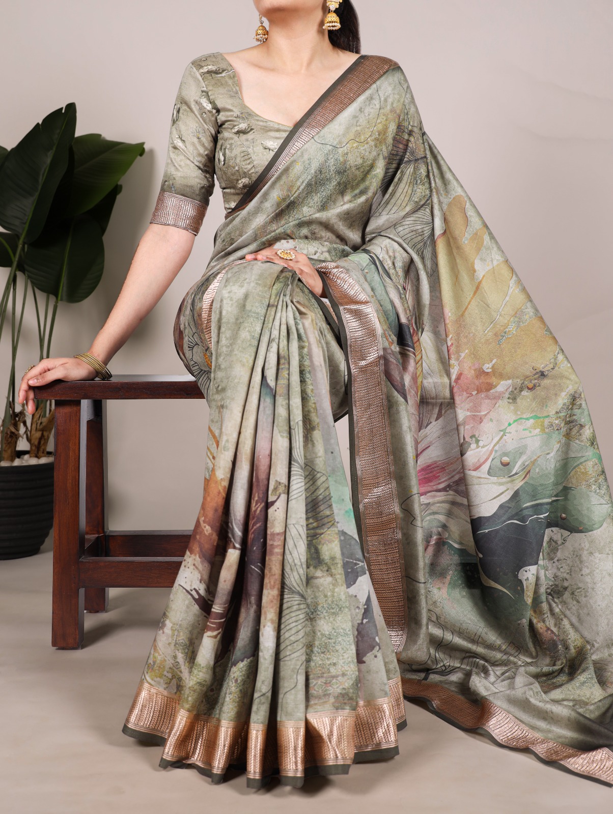 Fabrics | Saree Fabric : Tussah Silk With Viscose Border Saree Work : Printed Saree Length : 5.5 meterBlouse (Unstitched) Blouse Fabric : Tushar Silk With Viscose Border Blouse Work : Printed Blouse Length : 0.80 meter |