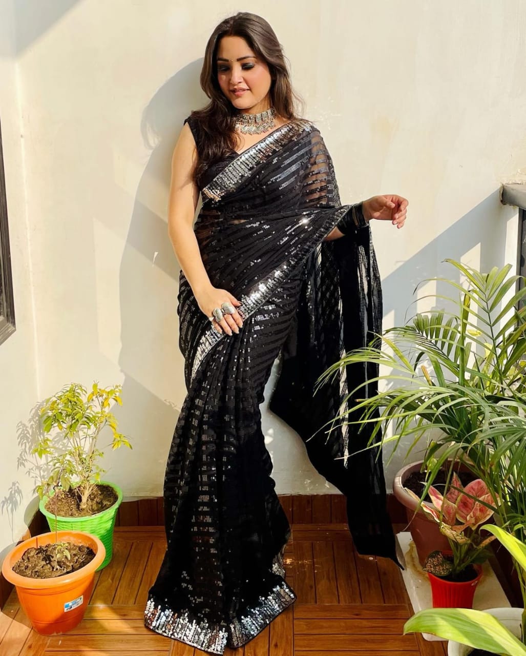 Fabrics | Saree : Georgette Work : Sequence work with Sequence lace Length : 5 .5 M Blouse : Heavy Mono Silk Type : Unstitched Length : 0.80 M |