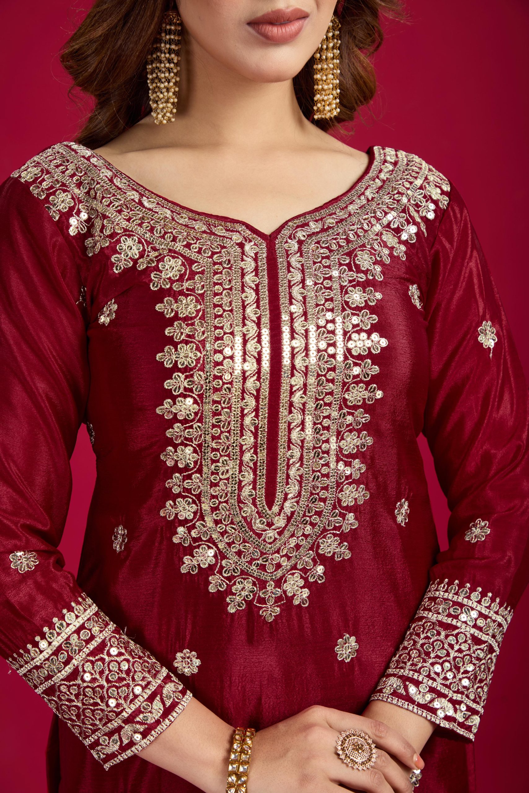 Marron Chinnon Silk With Embroidery Work Sharara Suit