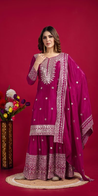 | Fabrics | Top :- :Pure Heavy Chinnon Silk With Embroidery And 5mm Sequence Work Sleeves :- Chinnon Silk With Embroidery And 5mm Sequence Work With Full Sleeves Dupatta :-:Pure Heavy Chinnon With Four Side Lace BorderSharara inner :Heavy Micro CottonSharara Palazzo Fabrics: Pure Heavy Chinnon Silk With 5mm Embroidery Sequence Work With Fully Flair Top Inner :-Heavy Micro Cotton Top Length :- 36-37Inch Size:- Free Size Semi Stitched |