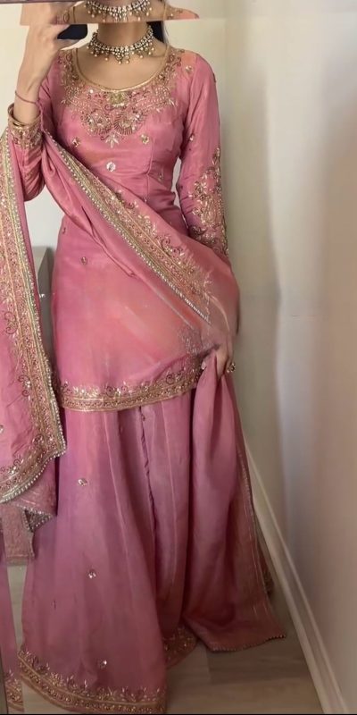 | Fabrics | Top Fabric : Heavy Pure Chinon Silk With 5mm Embroidery Sequence Work With Full Sleeve Top Inner : Heavy Micro Cotton Top Length : 38-39 Inch Top Size : Free Size Semi Stitched (FULLY STITCHED READY TO WEAR) Palazzo Fabrics : Heavy Pure Chinon Silk With 5mm Embroidery Sequence With Fully Flair Palazzo inner : Heavy Micro Cotton Palazzo Length : 40-41 Inch (fully stitched) Dupatta Fabric : Heavy Pure Chinon Silk With Lace Border Dupatta Length : 2.10MTR |