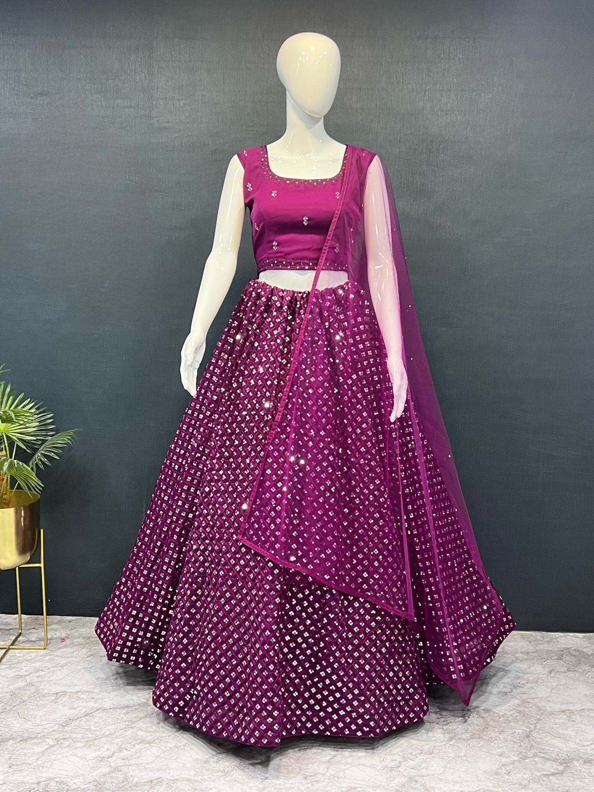 Fabrics | Lehenga : Heavy Georgette Work : Embroidery And Sequins Inner : Inner Silk Flare : 4.5 Mtr With Can-can Type : Semi-stitched Blouse : Heavy Georgette Silk Work: Embroidery with Sequins Work Sleeves: Half Inner : Inner Silk Dupatta : Heavy Net Work : four side lace border Size : 2.30 MTR |