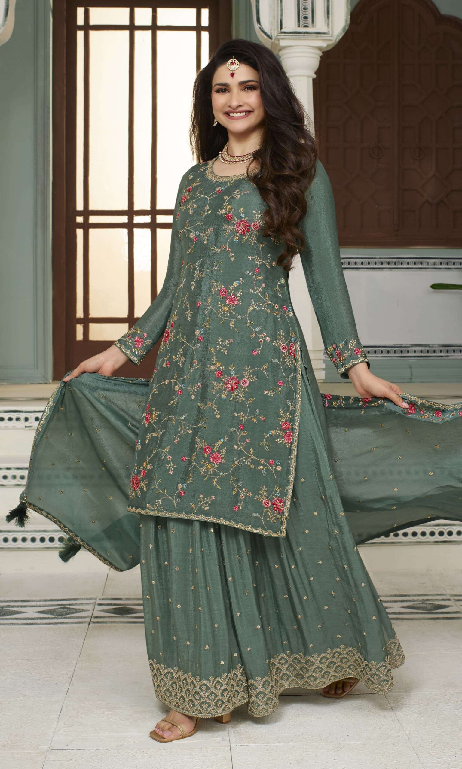 Material & Fabric Details Top :- Heavy Chinon Work : Embroidery multi workSleeves :- Heavy Chinon Sleeves Work : Embroidery multi work Inner :- Santoon Size:-Free Size Semi Stitched Palazzo :- heavy Chinon & multi work Palazzo Length: - 44 inner:-Santoon Type :- Semi Stitched ( Material ) Dupatta :-heavy Chinon+ multi work |