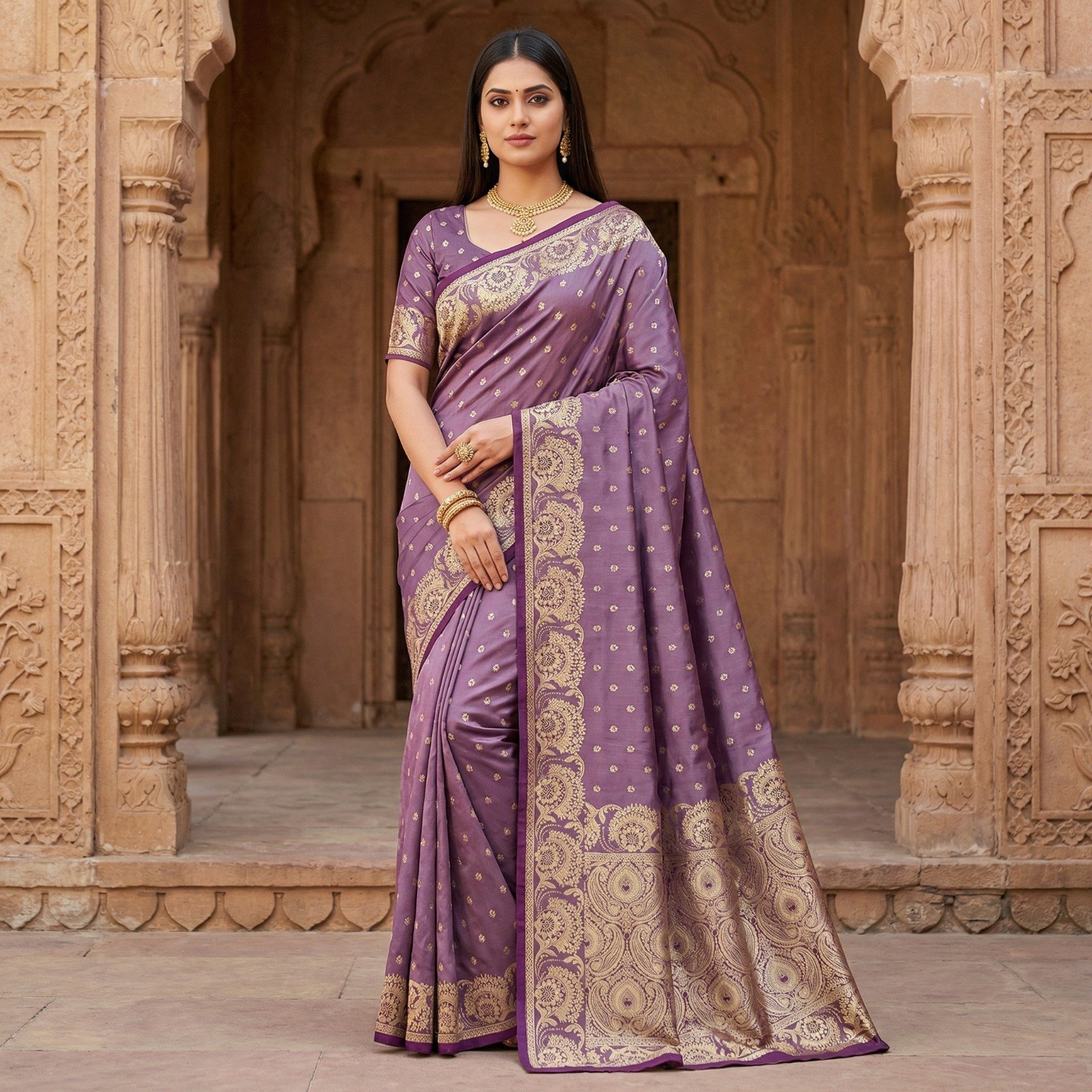 Saree :- a rich mauve-rose shade, enhanced with small woven gold butta motifs across the drape. The saree features a woven zari pallu with paisley and floral detailing.