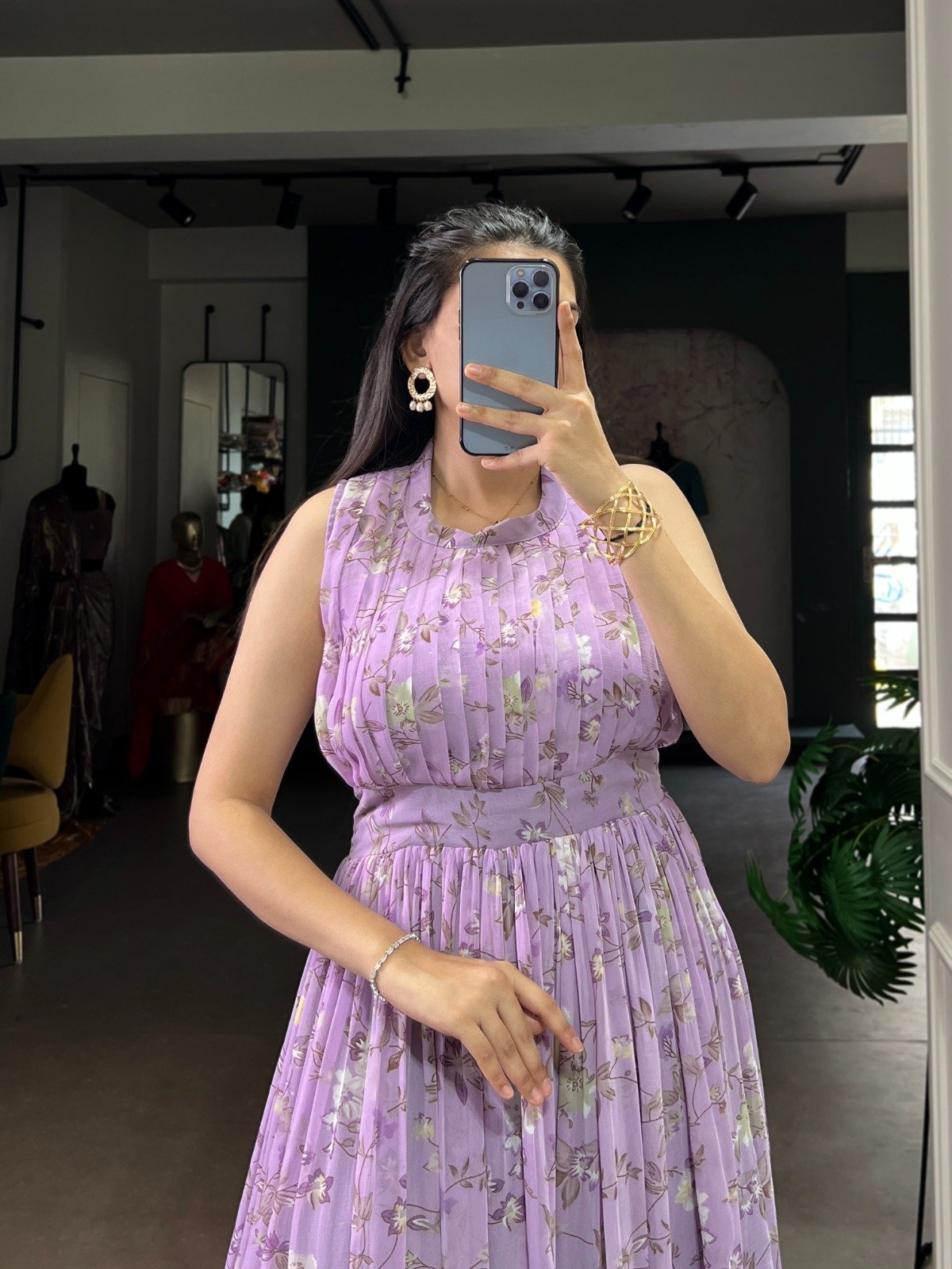 Gown (Stitched) Gown Fabric : Weightless Marbal Gown Work : Floral print Chest : 40" (Inside 2 inch extra margin available so you can adjust support up to 42 for your body comfort) Waist : 38" Length : 57" Flair : 3.40 Meter Lining : silk (full upto bottom) |