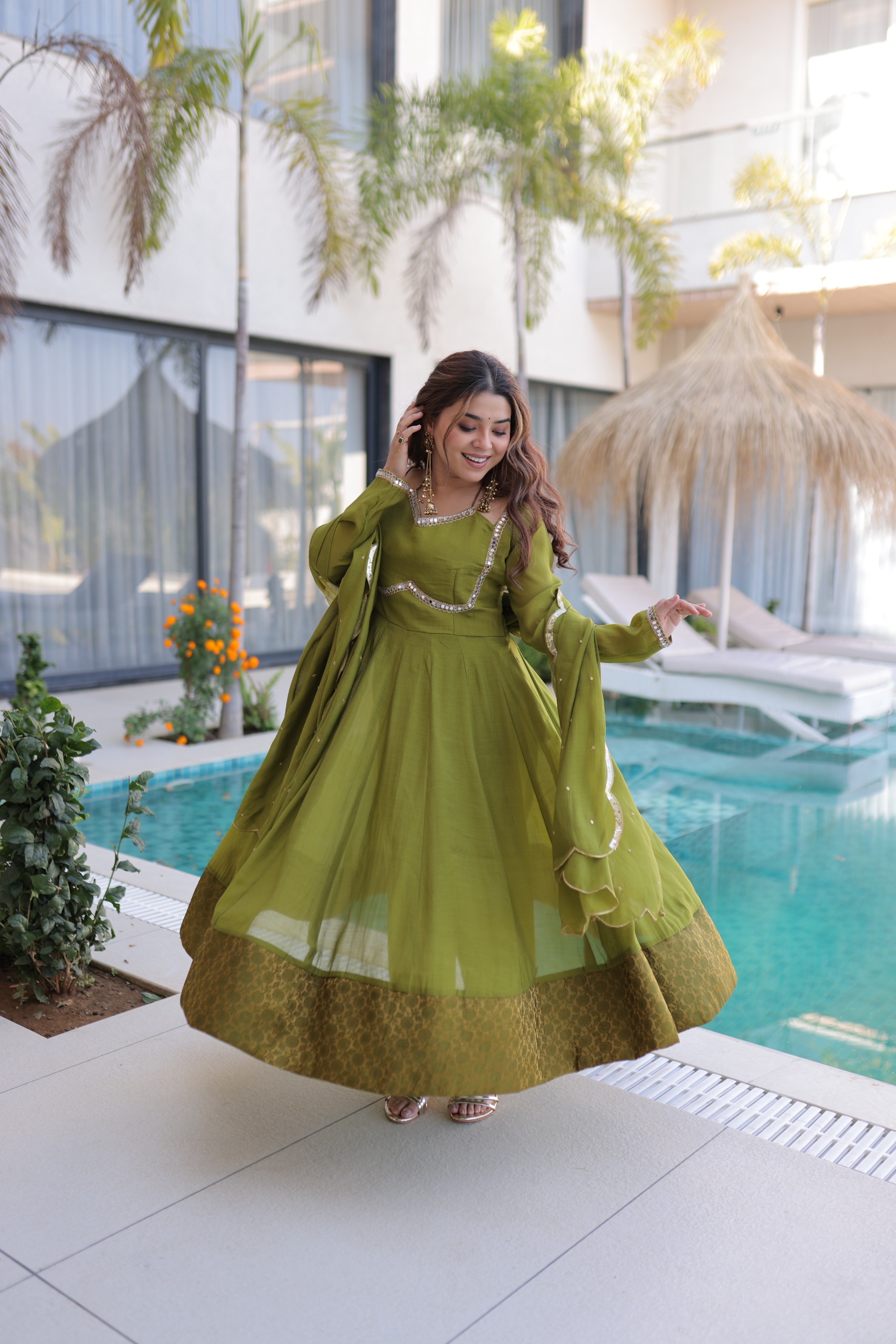 Lovely Mehendi Mul Chanderi Mirror Lace Work Anarkali Suit