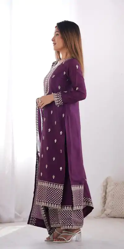 Wine Chinon Silk Embroidery Jari Work Salwar Suit