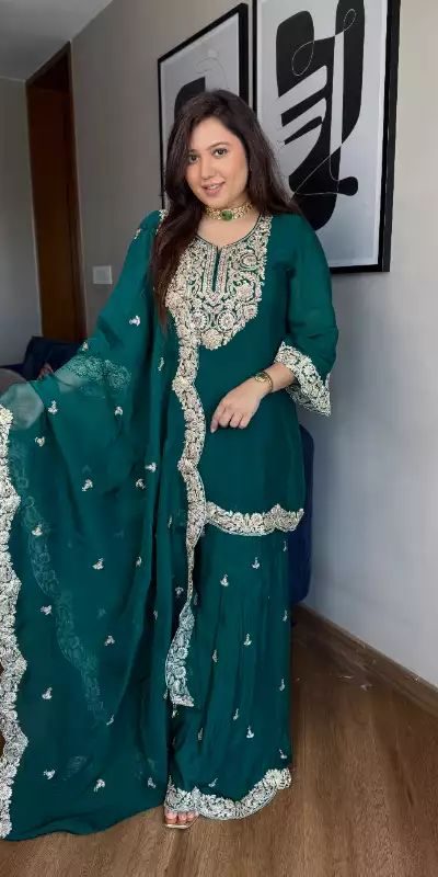 | Β Fabrics | Top Fabric :Pure Chinnon Silk With Heavy Embroidery Coding Dori-Sequence Work With Full Sleeve Top Inner : Heavy Micro Cotton Top Size :Free Size Fully Stitched Ready To Wear Top Length : 39-40 Inch Palazzo Fabrics :Pure Chinnon Silk With Heavy Embroidery Coding Dori-Sequence Work With Elastic fully stitched Plazzo Length:40-41 Inch Dupatta Fabric : Pure Chinnon Silk With Embroidery Coding Dori-Sequence Work With Lace Border |