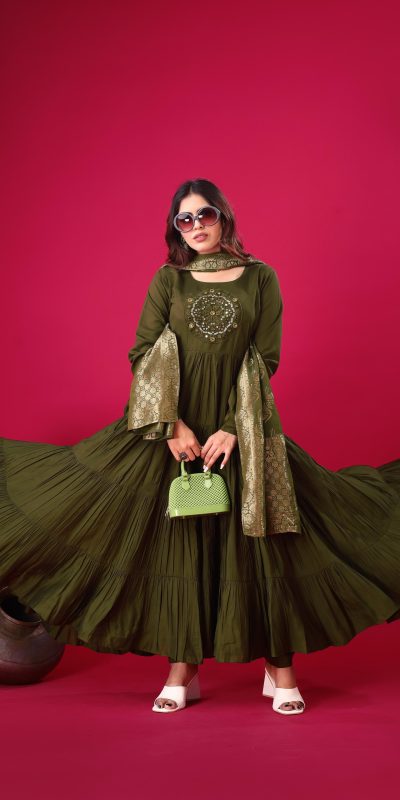 118 reviews for Mehandi Roman Silk With Embroidery Sequence Work Anarkali Gown