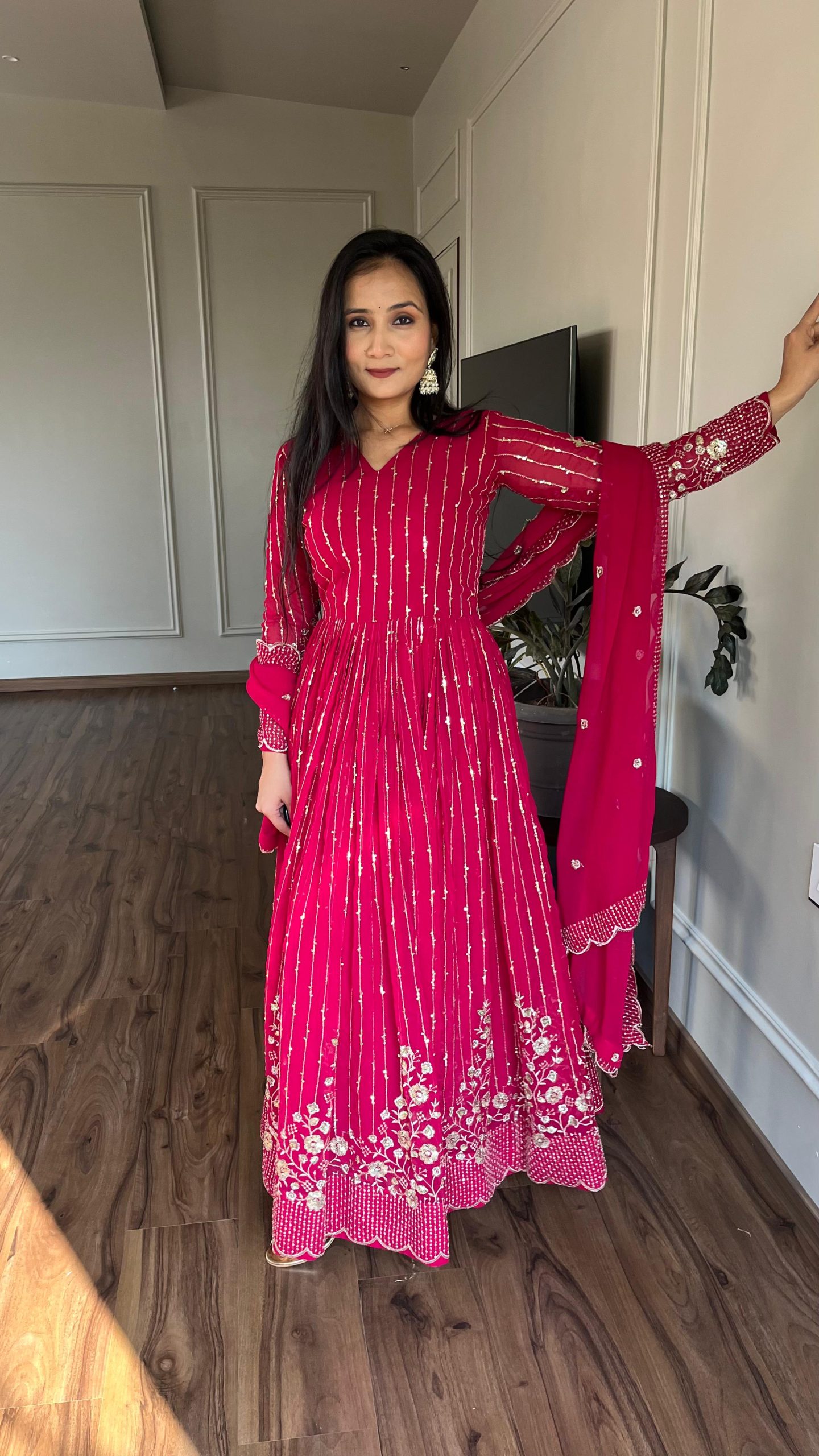 It’s a great gown. I’m 5.5β and thus it was touching my ankles with flats. If you wear heels then it might look a bit off. If you’re taller than me then it would look like a Midi Dress. Overall the fabric is beautiful Georgette. The sleeves are pretty and neck detail is also up to the mark.