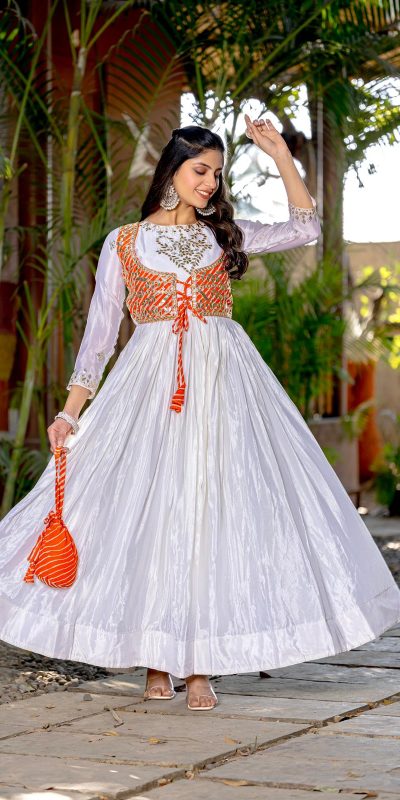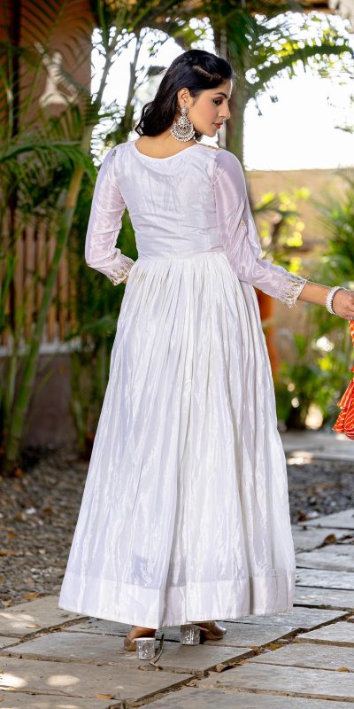103 reviews for White Chinon Laheriya Print Gotta Patti Cording Work Anarkali Gown