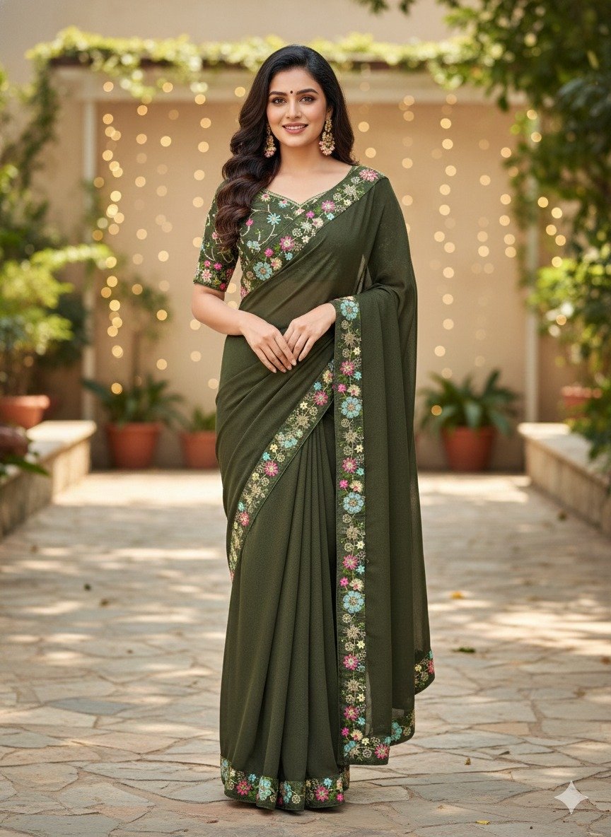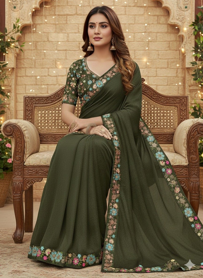 JR 658 Mahendi in Color Star Georgette ace Work & Embroidery Work Saree . Now at just ₹1699. Delivery 4-6 Working Days. Shop now. | Sarees, Bollywood Sarees, Creative Sarees, Designer Sarees, Embroidered Sarees, Ethnic Saree, Modern Digital sarees, Party Wear Sarees