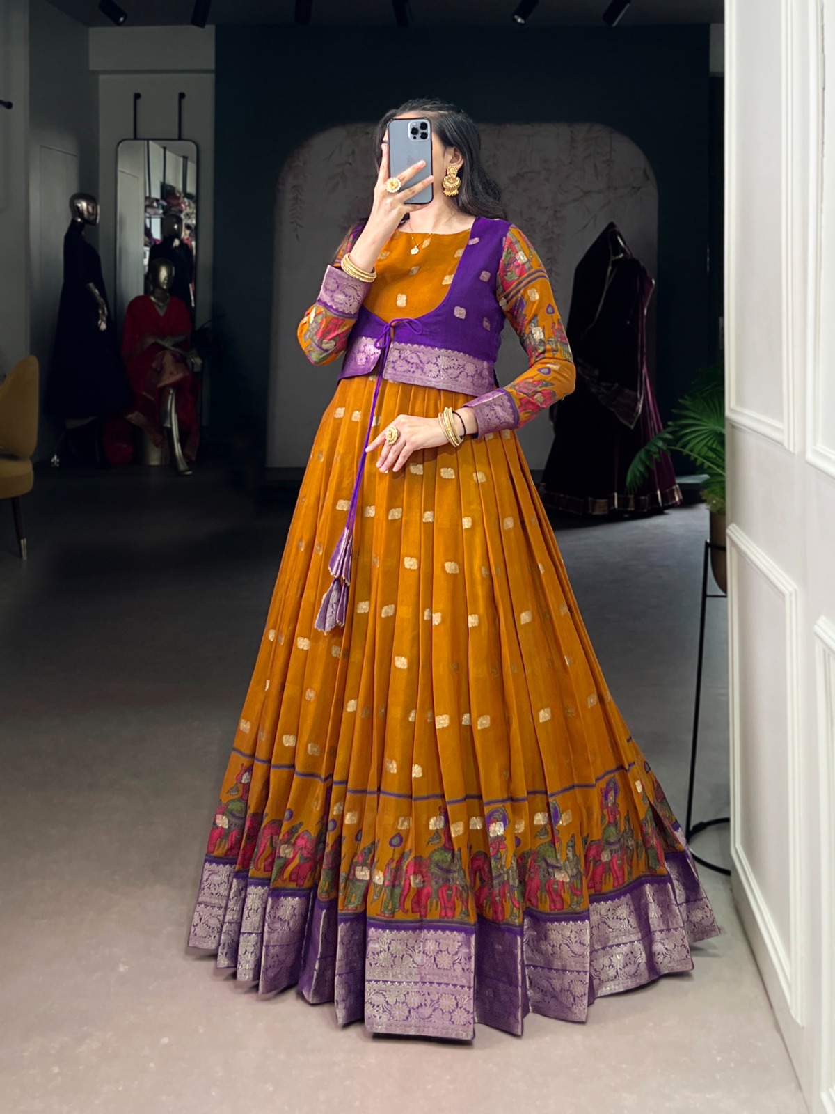 Gown Gown Fabric : Poly Cotton Gown Work : Kalamkari Print With Zari Weaving Work Border Gown Chest Size : 40″ (Inside 2 inch extra margin available so you can adjust support up to 42 for your body comfort ) Gown Waist Size : 38 “ Gown Shoulder :15 “ Gown Length : 56″ Sleeve Length : 24″ Gown Flair : 4 Meter Gown Lining : Micro Cotton Koti Koti Fabric : Poly Cotton Koti Work : Zari Weaving Work Koti Chest Size : 40″ (Inside 2 inch extra margin available so you can adjust support up to 42 for your body comfort ) Koti Length : 15″ |