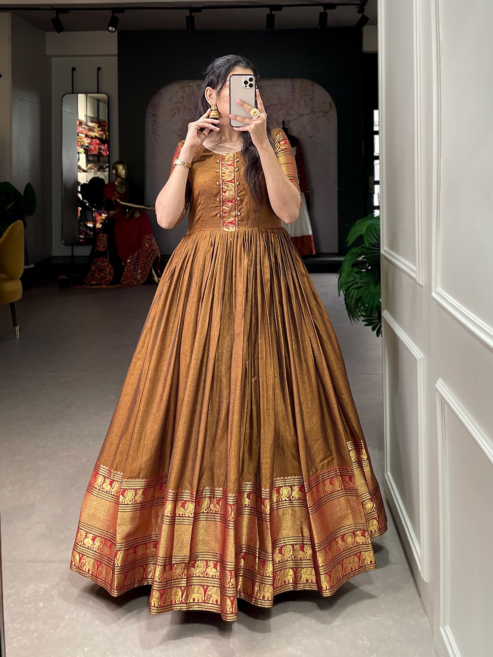 Fabrics | Gown Fabric : Narayan pet (cotton) Gown Work : Zari weaving work Gown Chest : 40″ (Inside 2 inch extra margin available so you can adjust support up to 42 for your body comfort) Stitching : Stitched With Canvas Gown Waist : 38″ Gown Length : 57 Sleeve length : 12 Shoulder : 15 Flair : 3.50 Meter Lining : silk (full upto bottom) |