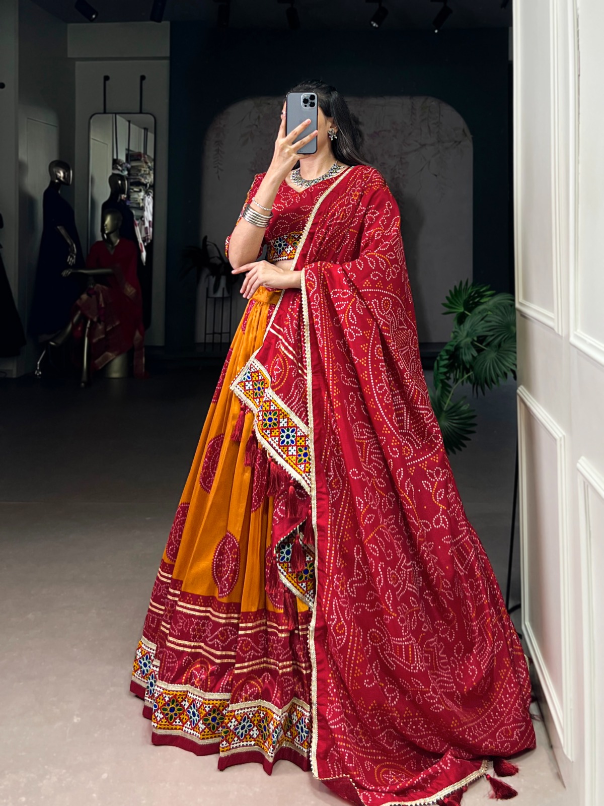 Mustard Tasar Silk Gamthi Work Lehenga Choli