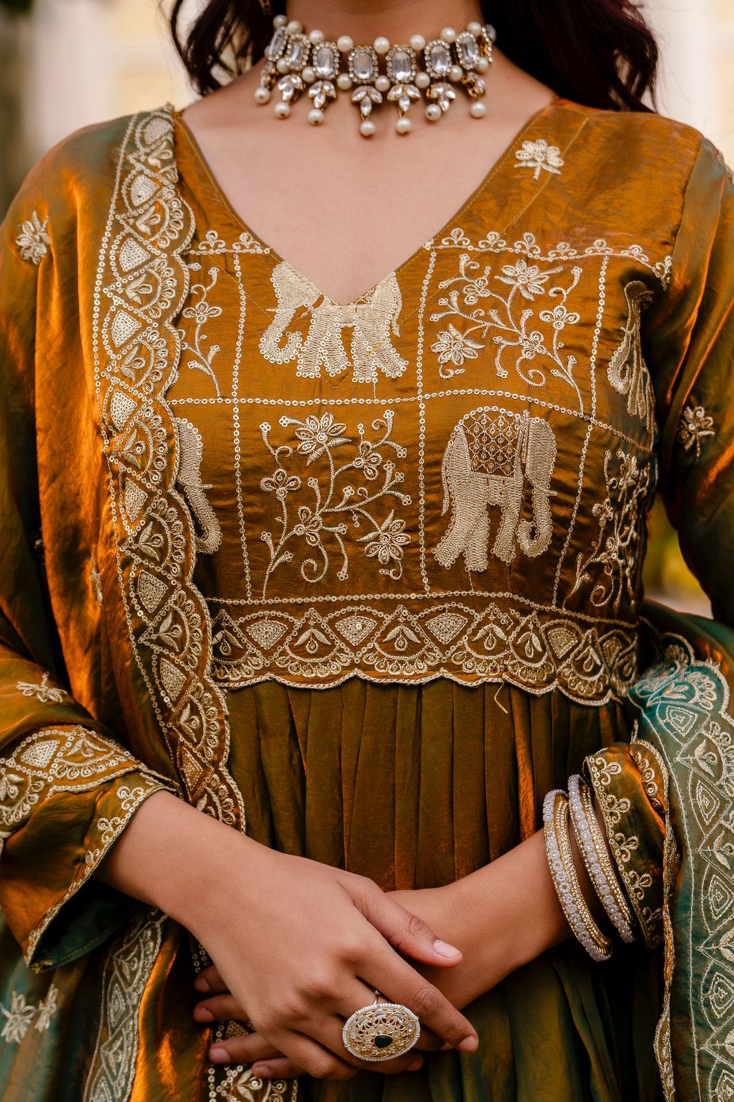 Roka function me styling with oxidised jewellery ke saath kiya, logon ne bola achha combination. Gown simple, fabric medium thick. Under arms sweat visible nahi hua. Bas belt ka hook weak, toot gaya end me.