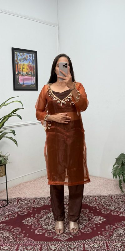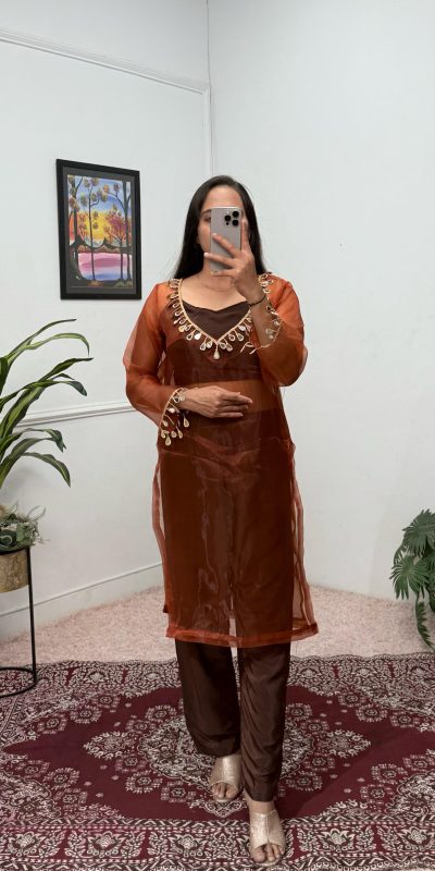 117 reviews for Brown Organza Mirror Lace Work Salwar Suit