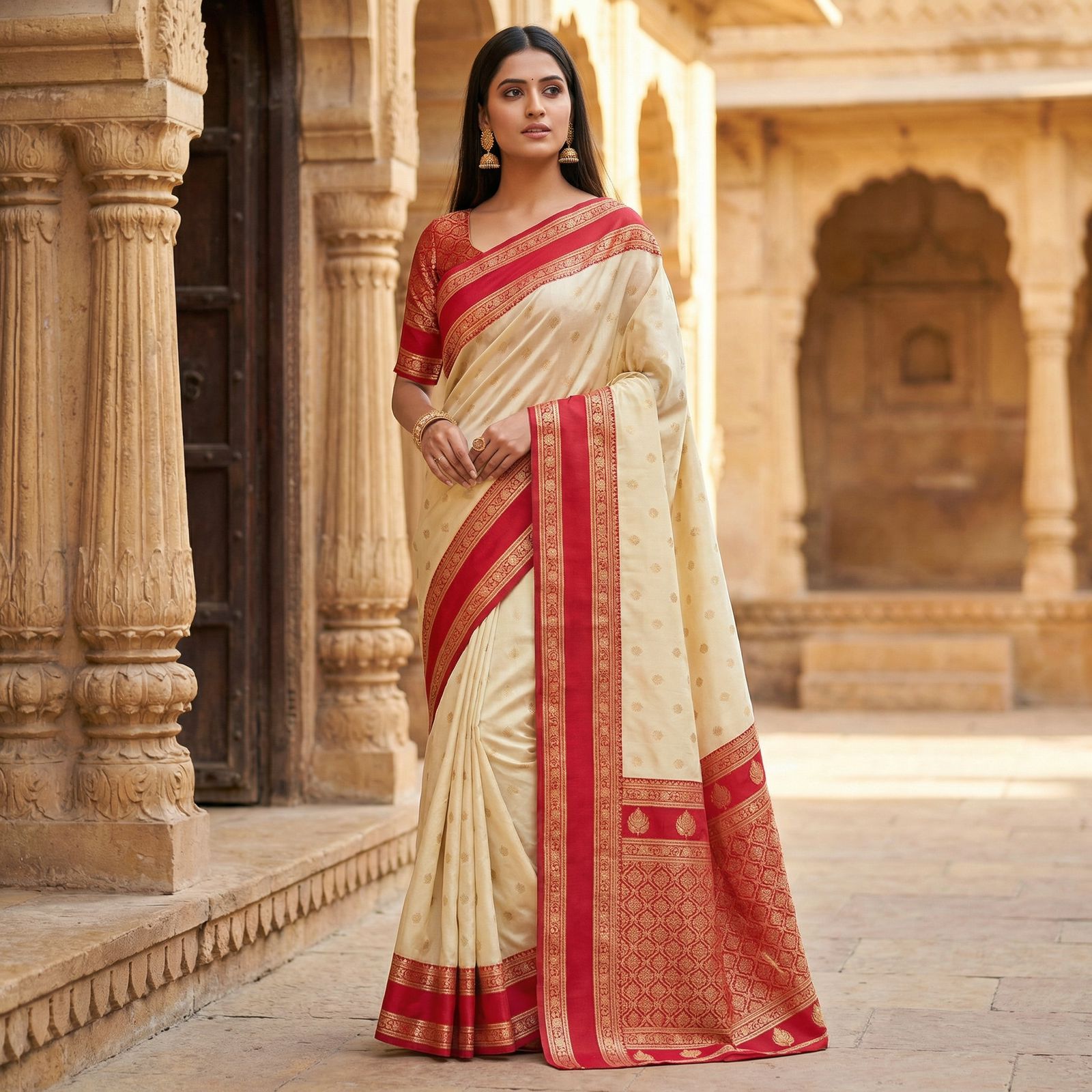 Saree :- gold zari butta motifs scattered gracefully across the body. The pallu heavy zari weaving with classic paisley and floral motifs.