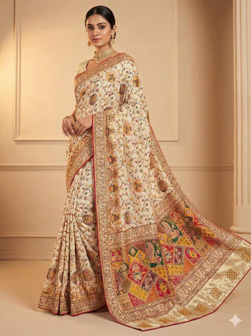 Saree Work : Zari Work, Lace Border, Lace Work Weaving Saree With Kashmir Thread Woven Pallu With Zari Weaving Border