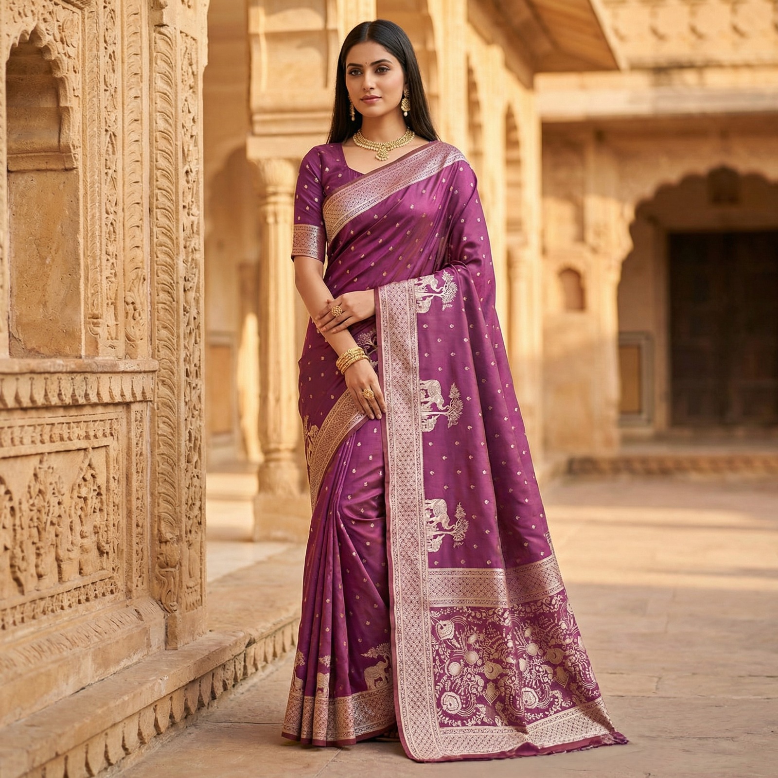 Blouse :- Matching soft pure silk weaving blouse piece with subtle zari motifs and a coordinated rich border for a complete graceful look.