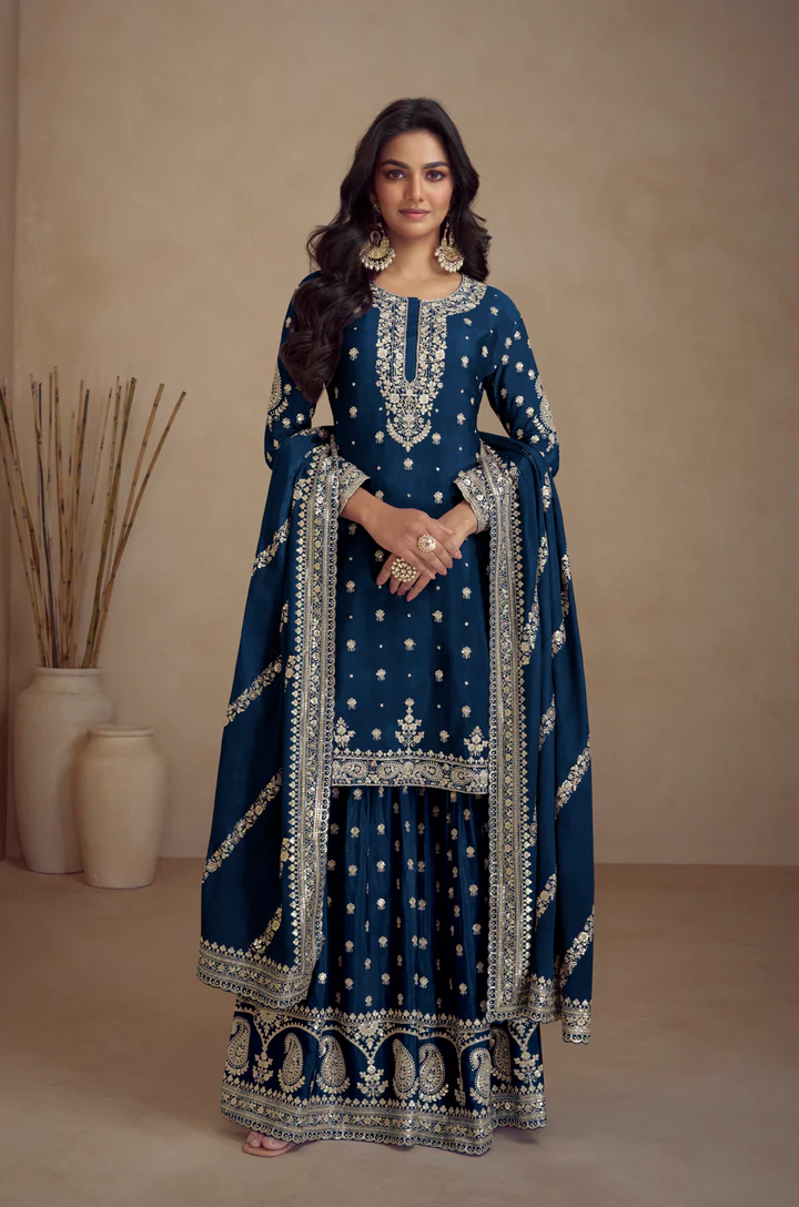 Peaceful Teal Chinon Silk Embroider Work Salwar Suit