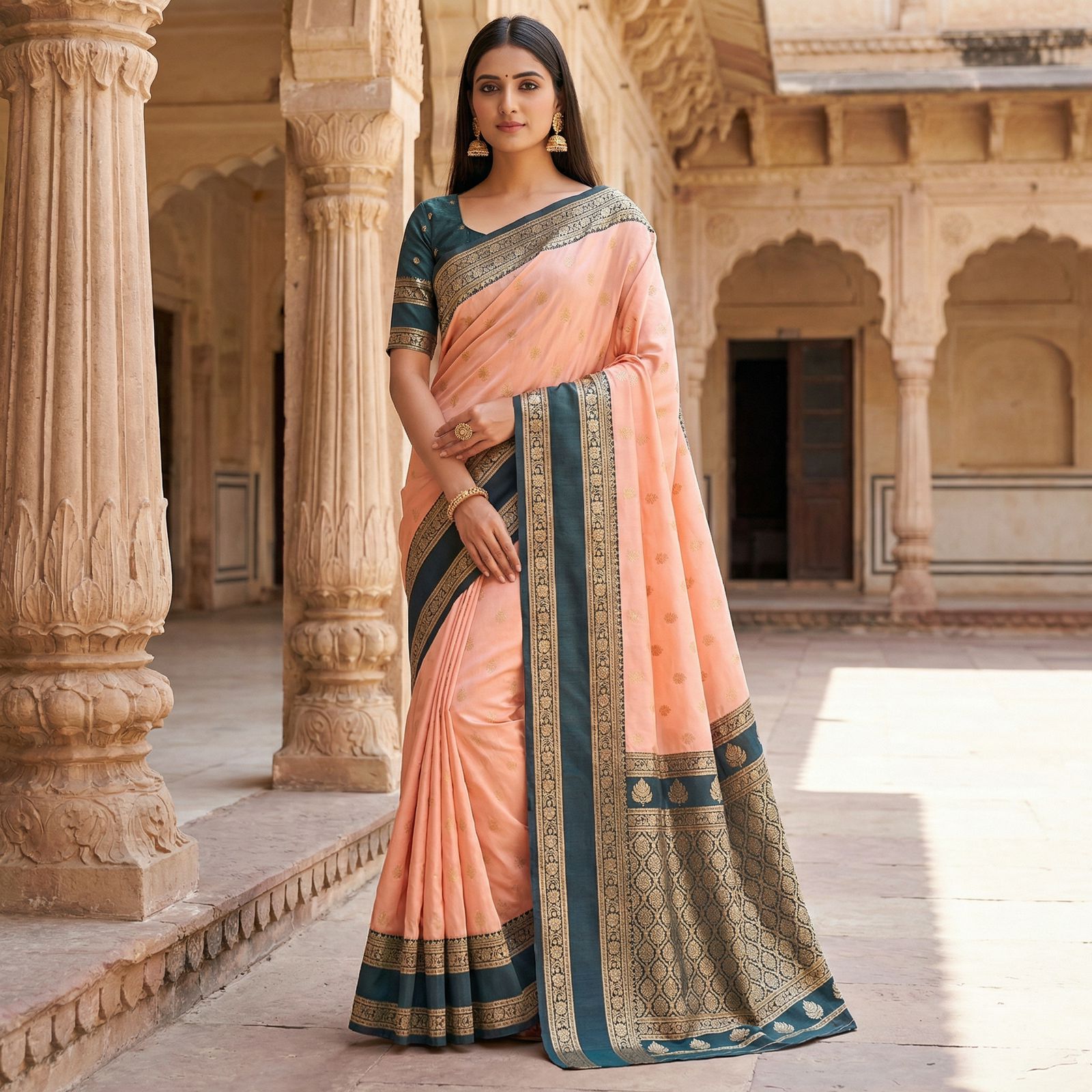 Saree :- gold zari butta motifs scattered gracefully across the body. The pallu heavy zari weaving with classic paisley and floral motifs.