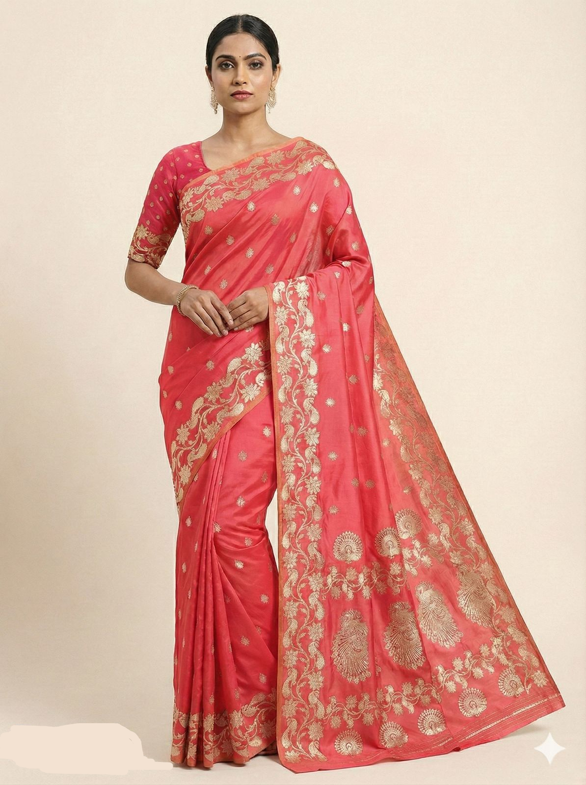 Blouse :- Matching soft pure silk weaving blouse piece with subtle zari motifs and a coordinated rich border for a complete graceful look.