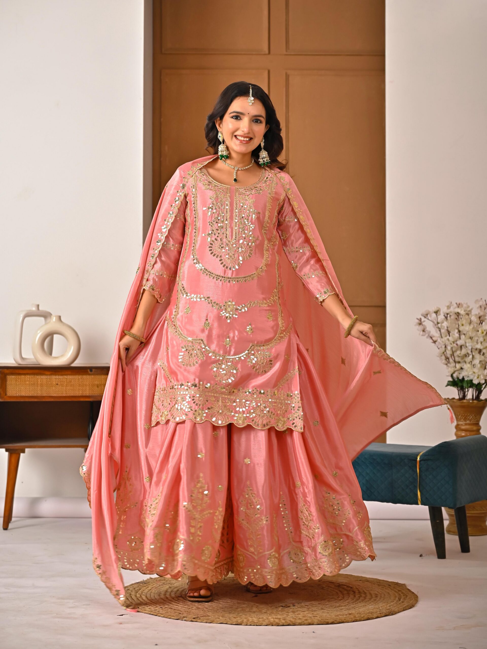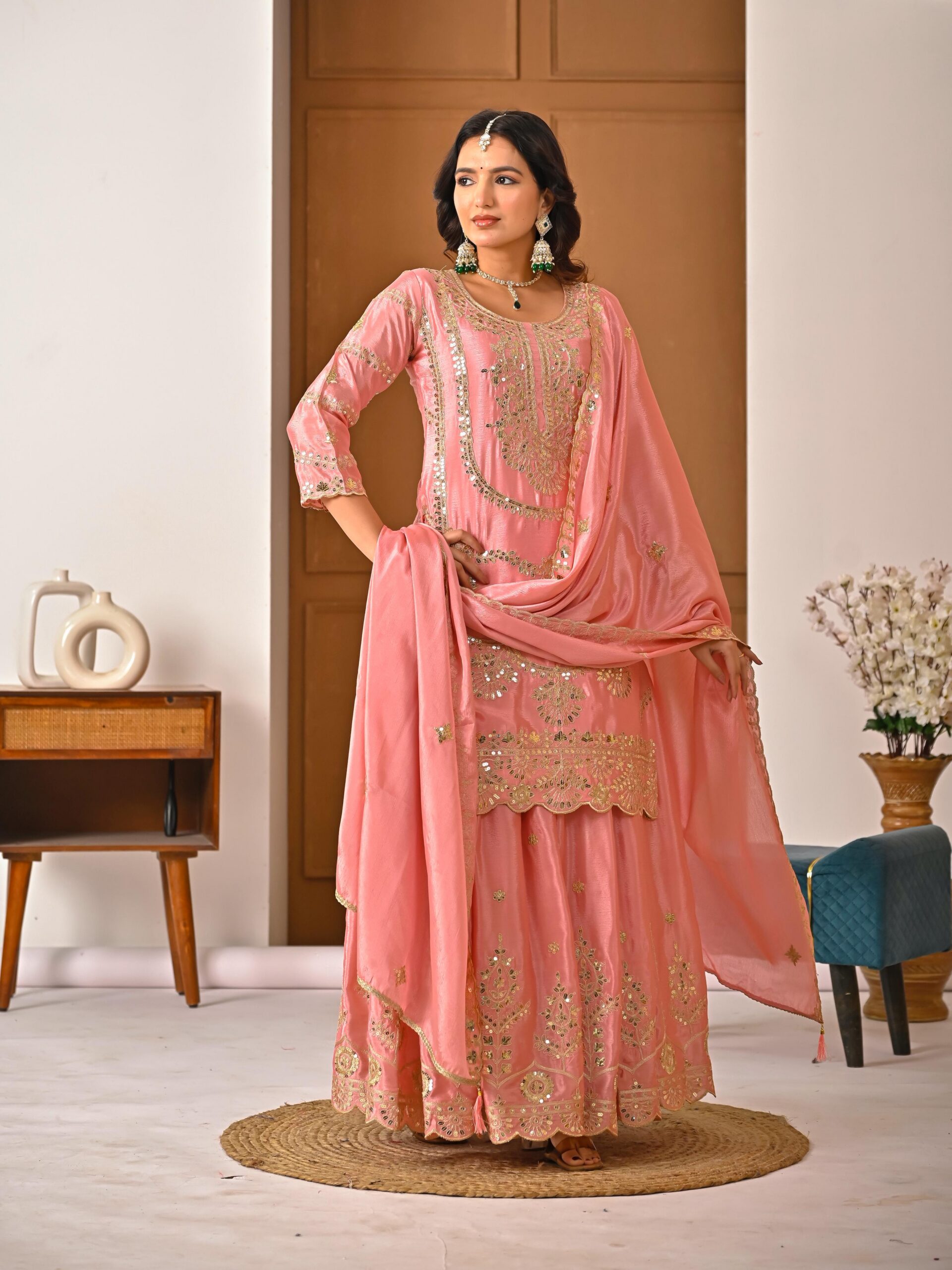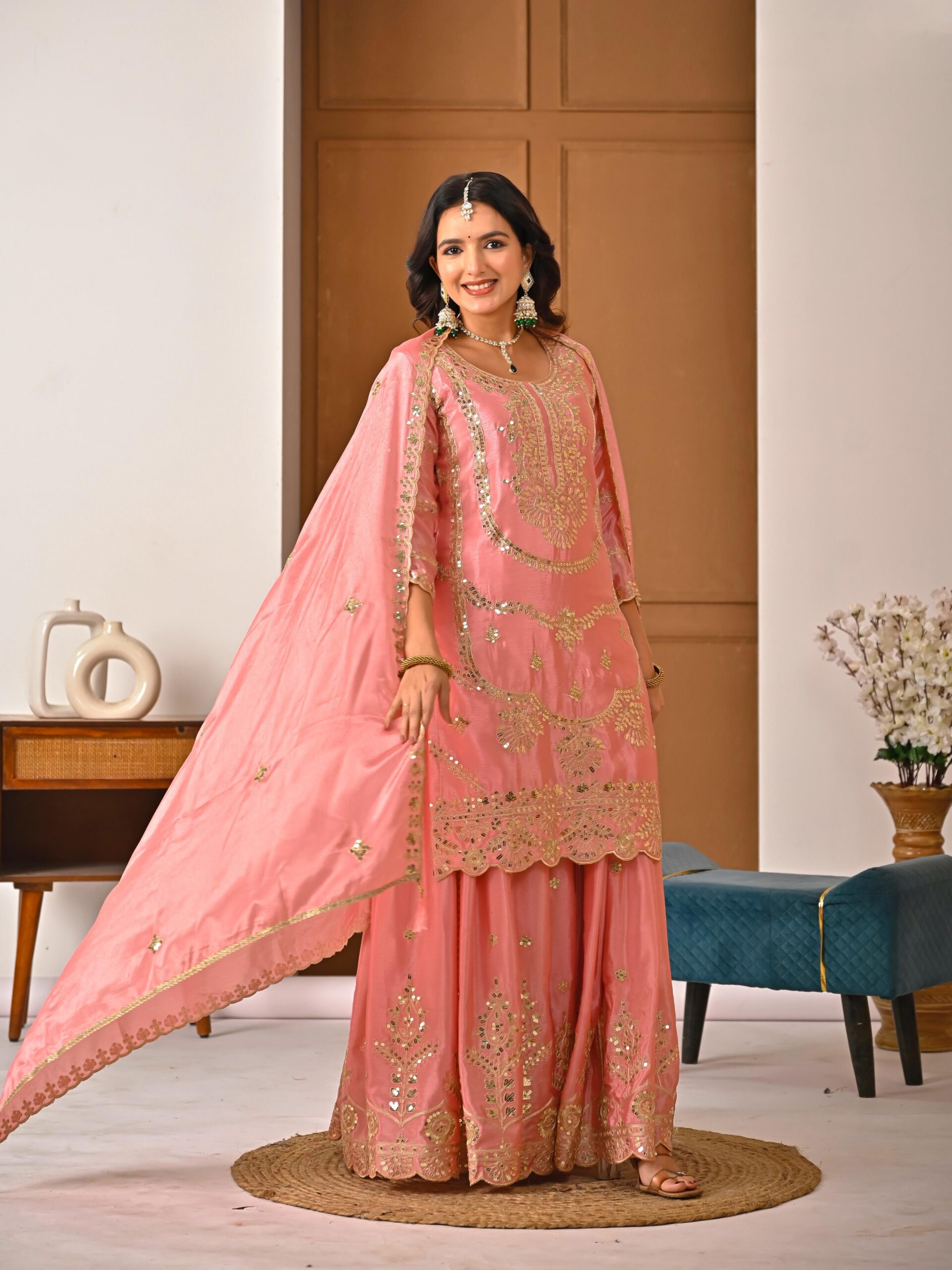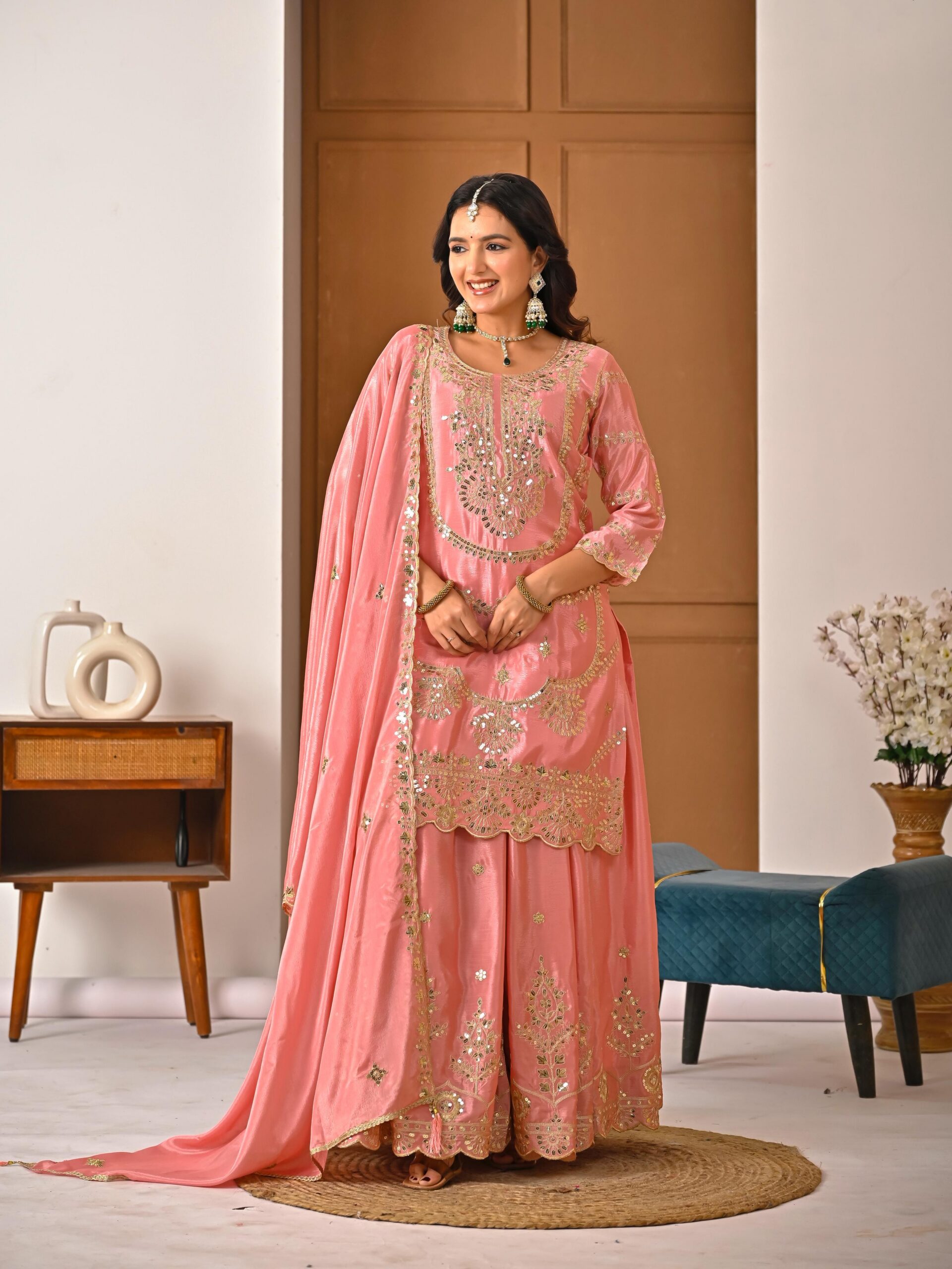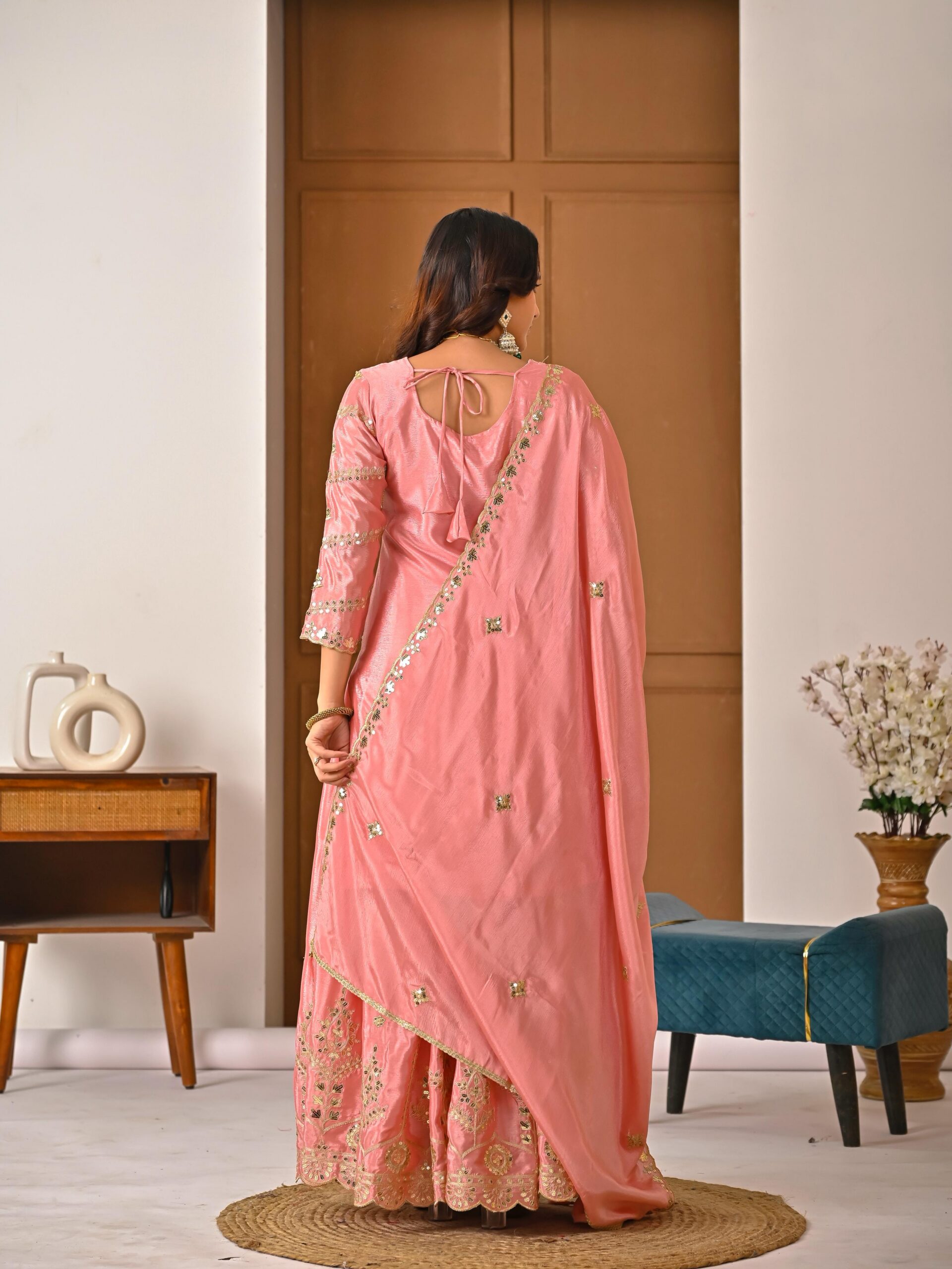 Palazzo fabric :Pure Heavy Chinon Silk With Heavy Embroidery Coding Sequence Work (Fully Stitched)