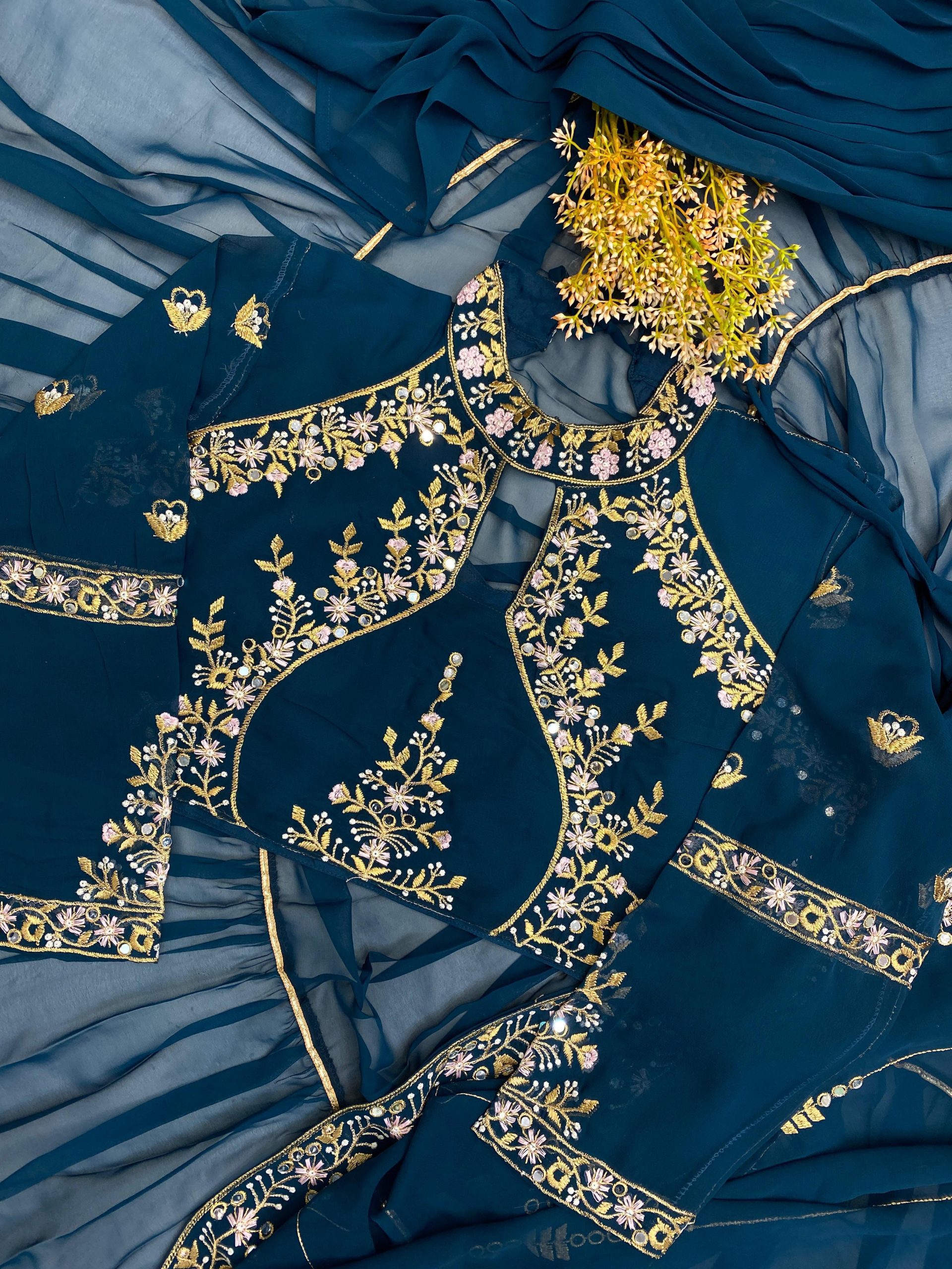 Peacock Blue Georgette Embroidery Lehenga Saree