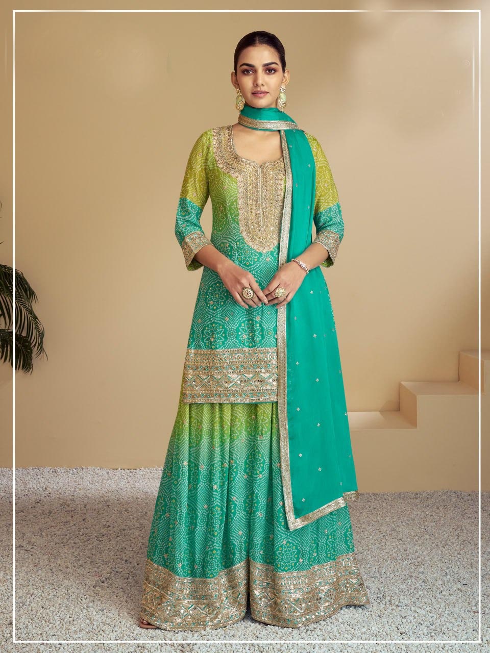 Fabrics | Top :- Heavy Chignon Digital Print with Embroidery Multi & 3mm Mat Sequence work Sleeves :- Heavy Chignon Digital Print with Embroidery 3mm Mat Sequence work Dupatta :- Heavy Chignon with Embroidery 3mm Mat Sequence work Top Inner :- Attach Heavy Crepe Silk Bottom Inner :- Heavy Crepe Silk Top Length :- Max up to 32”inch Size:- Free Size Semi Stitched |