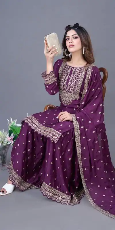Fabrics Top Fabric : Heavy Chinon Silk With *Heavy Embroidery Sequence Work with Sleeve Top Inner :Heavy Micro Cotton Top Length : 43-44 Top Size. : Free Size Semi Stitched (Fully Stitched Complete Ready To Wear)Sharara Fabrics : Heavy Chinon Silk With  Heavy Embroidery Sequence Work With Flair Sharara Length:40-41 Inch (fully stitched)Dupatta Fabric : Heavy Chinon Silk With *Heavy Embroidery Sequence Work and Lace Border