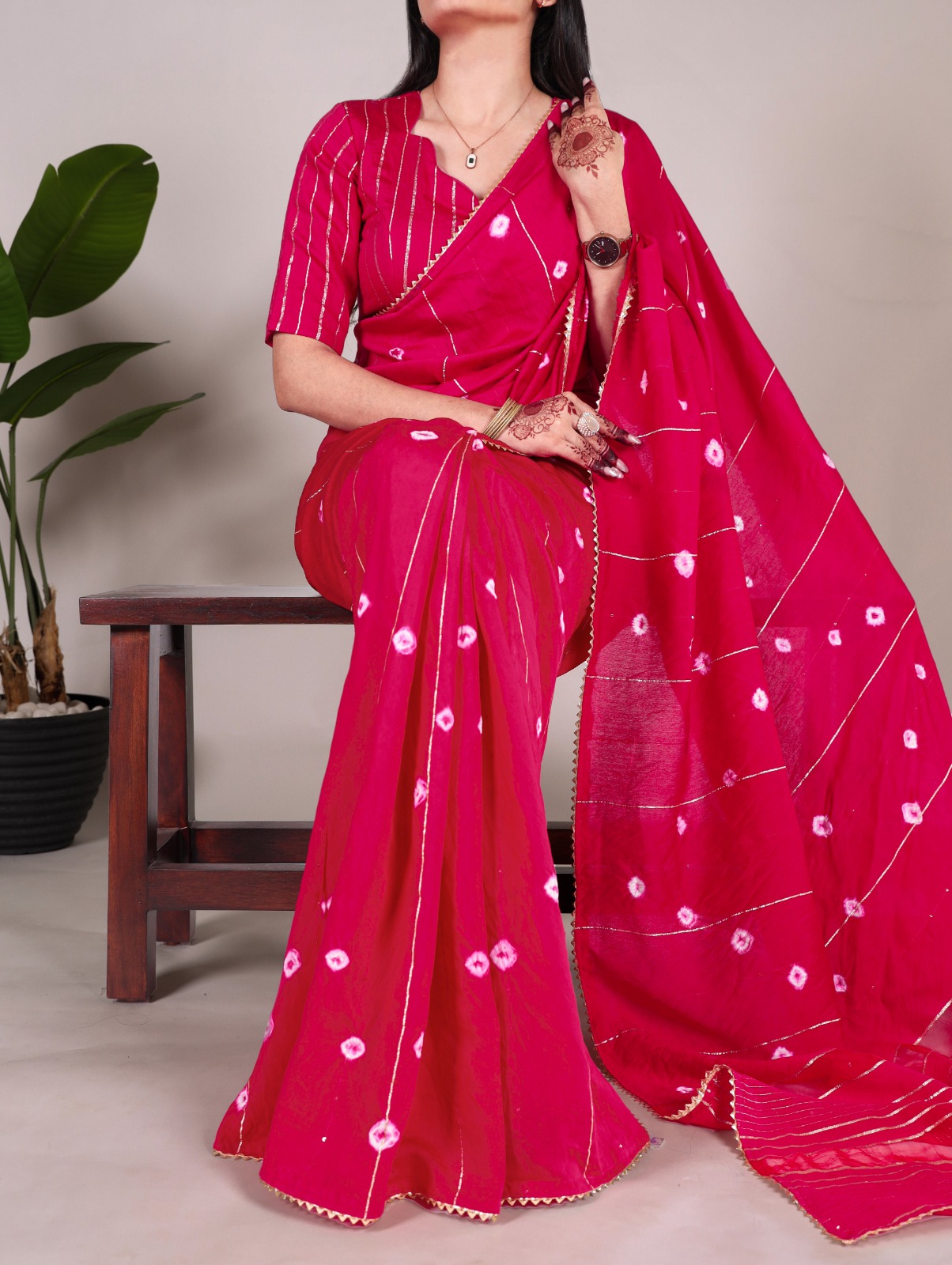 Saree Saree fabric : Viscose chanderi Saree work : Sequins with zari line and gota patti lace border Saree length : 5.5 meter Blouse (Unstitch) Blouse Fabric : Viscose Chanderi Blouse Work : Sequins and zari line Blouse Length : 1 meter |