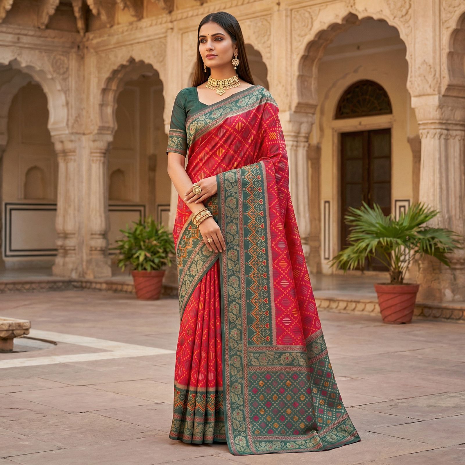 Blouse :- Pochampalli silk weaving Brocade blouse piece with zari-woven sleeve border.