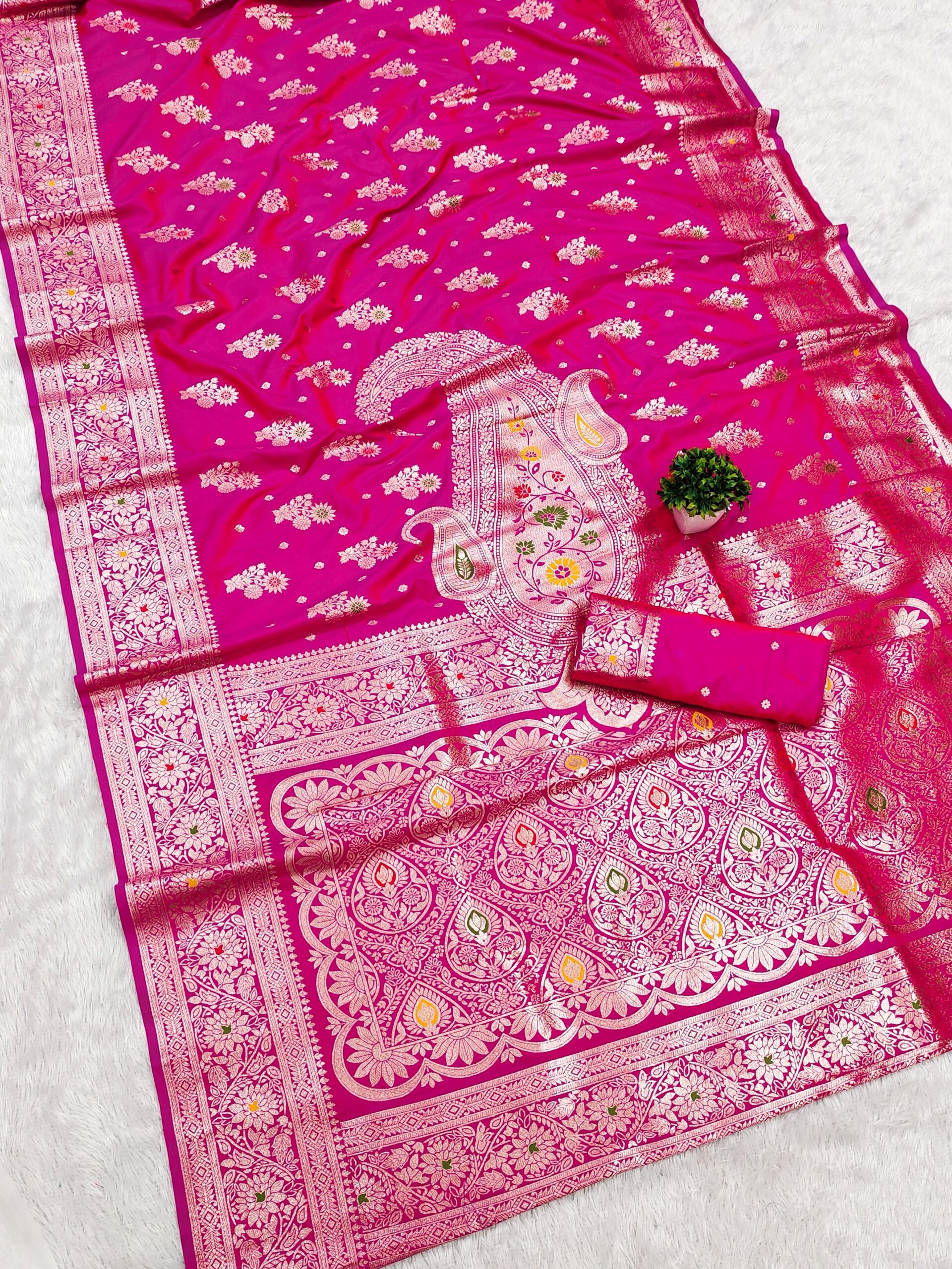 Saree :- Soft banarasi silk  with gold zari weaving design motifs all over the & zari weaving rich pallu with zari weaving contrast border.