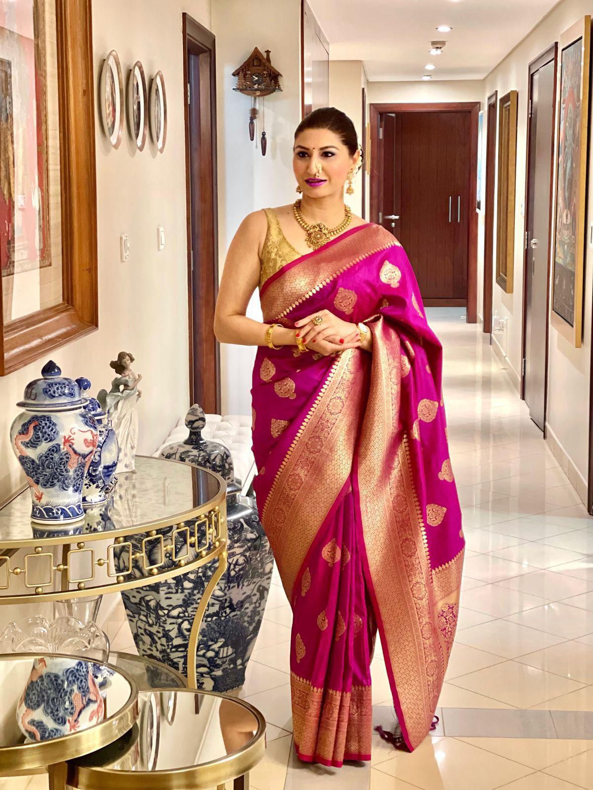 Silk blend Indian saree ka weight thoda zyada hai; long events me shoulders pe mehsoos hota, chote occasions me time pass ke liye theek.