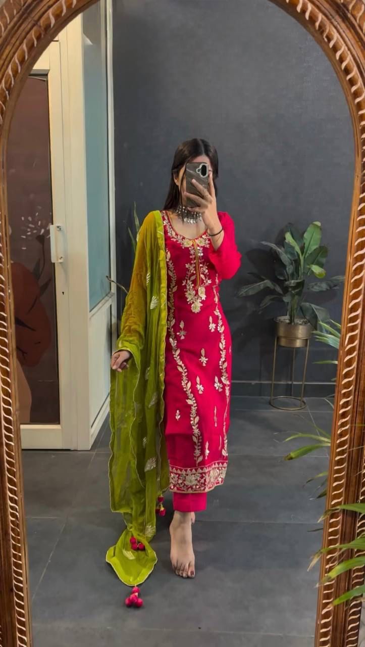 Fabrics Top Fabric : Pure Heavy Chinon Silk With Heavy Embroidery 5mm Sequence Work And Full Sleeve Top Inner : Heavy Micro Cotton Top Length : 41-42 Inch Top Size. : Free Size Semi Stitched (FULLY STITCHED READY TO WEAR) Bottom Fabrics : Pure Heavy Chinon Silk With Embroidered Sequence Work (Full stitched) Dupatta Fabric : Pure Heavy Faux Georgette with Embroidery-Sequence Work lace border And Lass Border