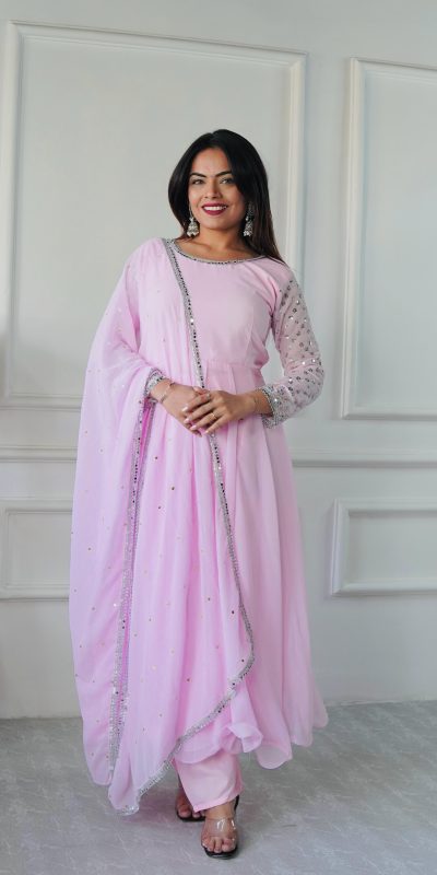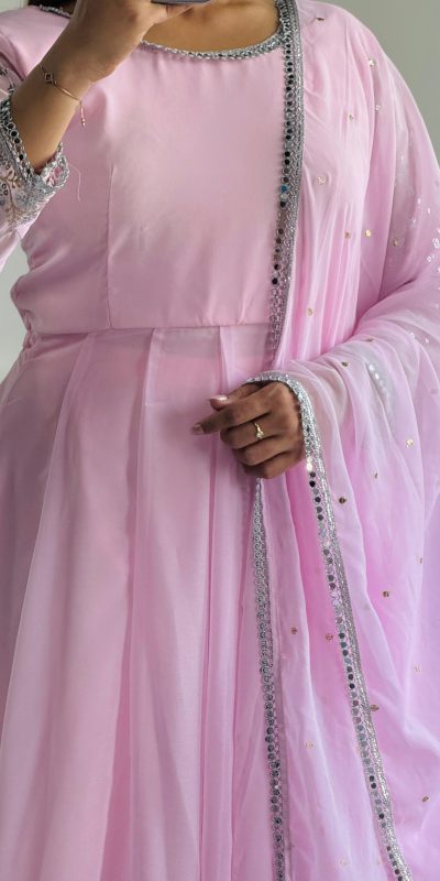 | Β Fabrics | Gown Fabric :heavy Foix Georgette With Embroidery Work And Full Sleeves Gown Inner : Micro Cotton Gown Size : Free Size Sami stitched Gown Length : 51-inc Gown Flair : 5-mtr Fully Stitched Bottom Fabric :heavy Micro Cotton And Elastic Dupatta Fabric :fox Georgette And Four Side Embroidery Work And Lace Border |